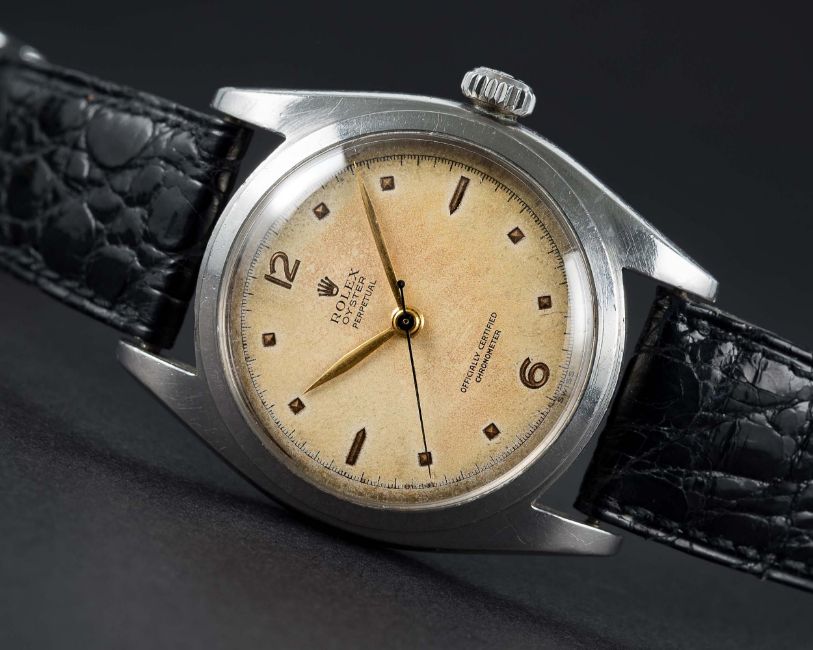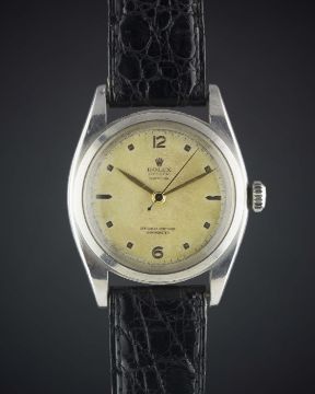 A RARE GENTLEMAN'S LARGE SIZE STAINLESS STEEL ROLEX OYSTER PERPETUAL "BUBBLE BACK" CHRONOMETER WRIST WATCHCIRCA 1952, REF. 6098Movement: Automatic chronometer, signed Rolex Perpetual, numbered.Case: Diameter approx. 36mm, Oyster case, case back ref. 6028, signed Rolex, dated IV.52, numbered, Rolex Oyster crown.Strap: Leather. CONDITION REPORTDial: Original dial in very good condition, showing signs of age and an even patina.Movement: Working at present.Case: In very good condition, with scratches due to general use.Strap/Bracelet: In good condition.