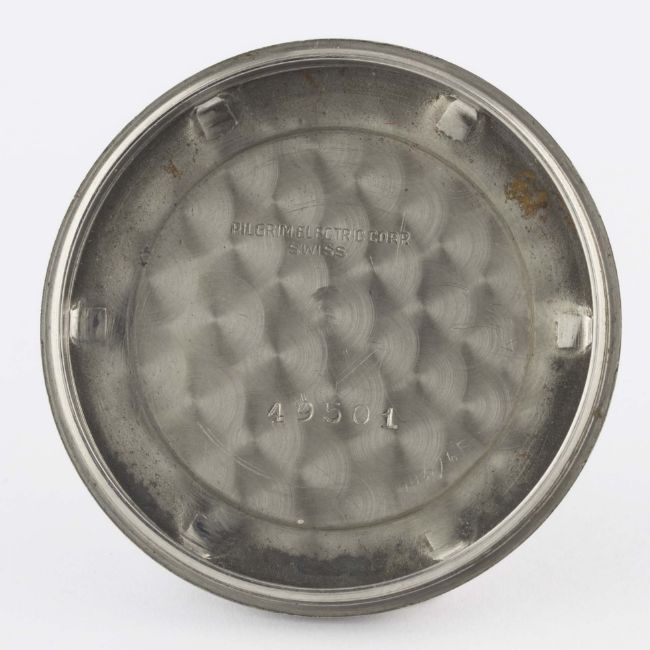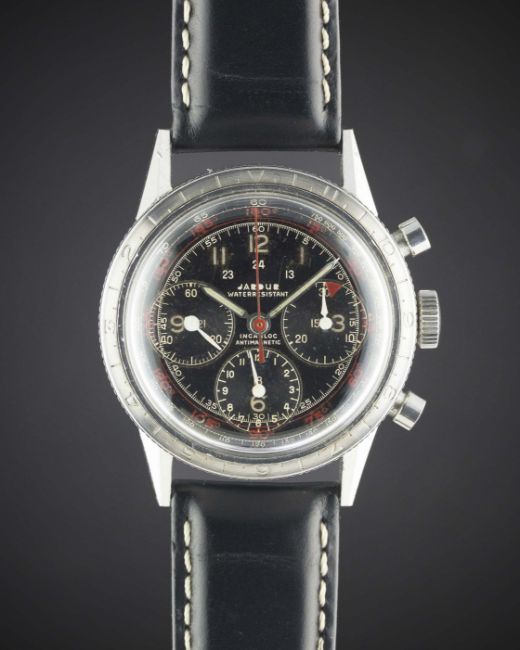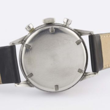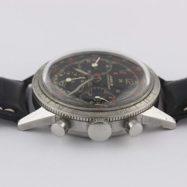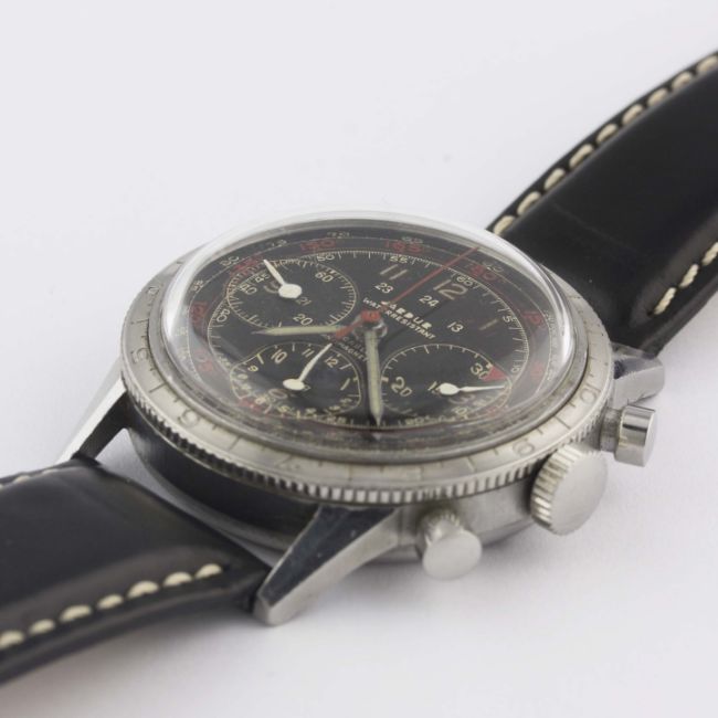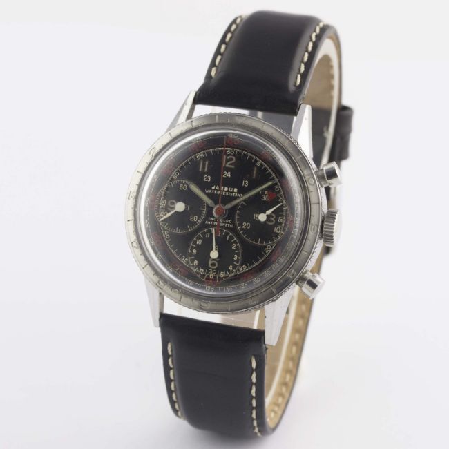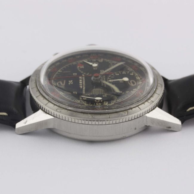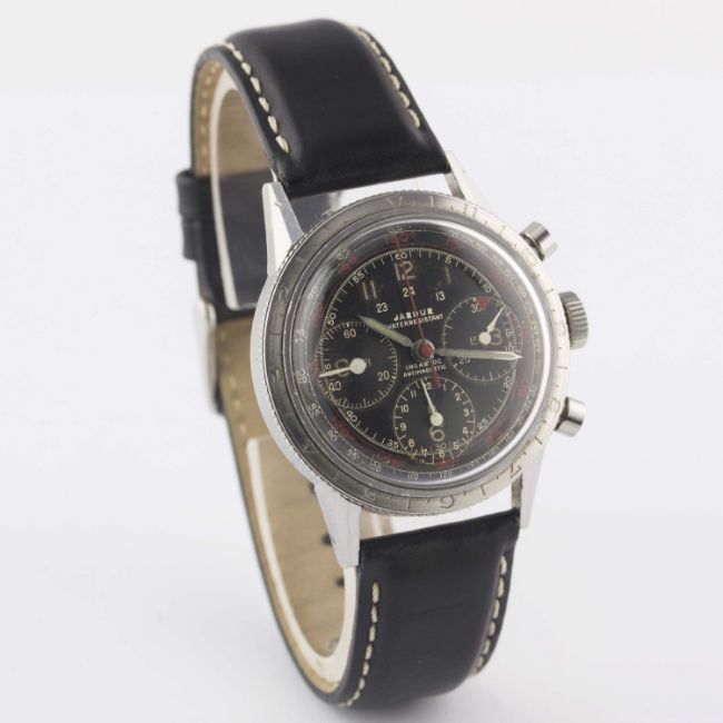 A RARE GENTLEMAN'S STAINLESS STEEL JARDUR BEZELMETER WATERPROOF PILOTS CHRONOGRAPH WRIST WATCH CIRCA 1940s, REF. 960 WITH GLOSS BLACK GILT DIAL, ACCOMPANIED BY ORIGINAL BOX, BOOKLET & AIR NAVIGATION PROTRACTORMovement: 17J, manual wind, Valjoux cal. 72, signed Pilgrim Electric Corp.Case: Diameter approx. 37mm, screw back, signed Pilgrim Electric Corp., numbered, 12 hour rotating bezel which can be used in conjunction with hour hand as flight countdown timer showing number of remaining hours as flight progresses.Strap: Leather. CONDITION REPORTDial: Original dial in very good condition, showing some signs of age.Movement: Working at present.Case: In very good condition, with some small scratches due to general use.Strap/Bracelet: In good condition.
