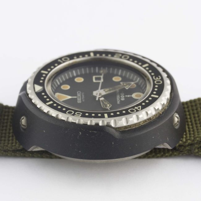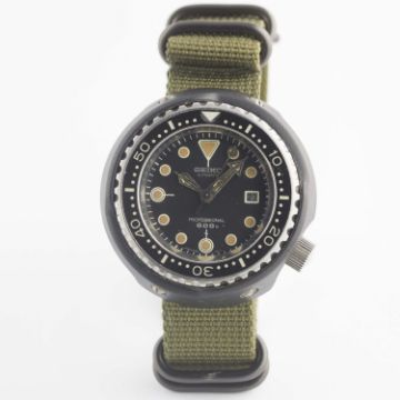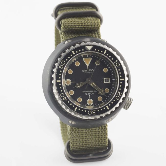 A RARE GENTLEMAN'S TITANIUM SEIKO "TUNA CAN" PROFESSIONAL 600M AUTOMATIC DIVERS WRIST WATCHCIRCA 1976, REF. 6159-7010Movement: 25J, automatic, quick-set date, signed Seiko. Case: Diameter approx. 51mm, one piece case, ceramic outer top coating, signed Seiko, wave emblem embossed on case back, numbered, 60 minute rotating bakelite bezel, screw-down crown.Strap: NATO. CONDITION REPORTDial: Original dial in excellent condition.Movement: Working at present.Case: In very good condition, with some light scratches due to general use.Strap/Bracelet: In excellent condition.