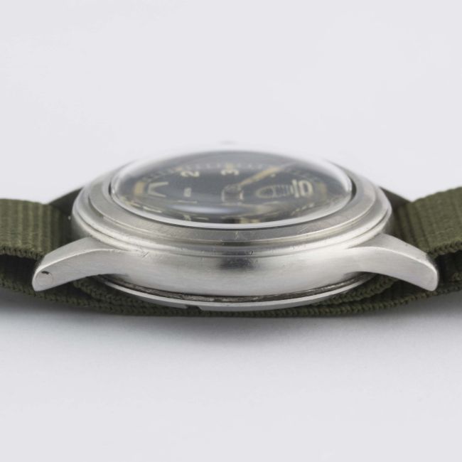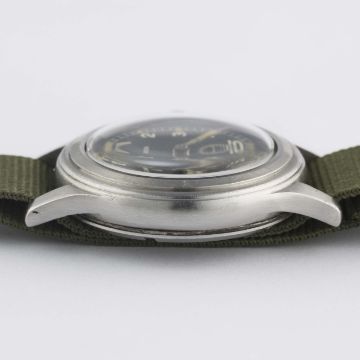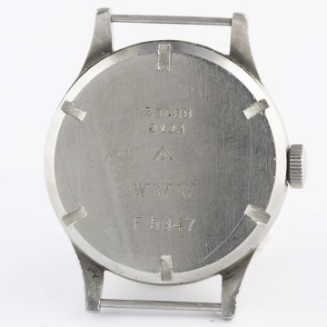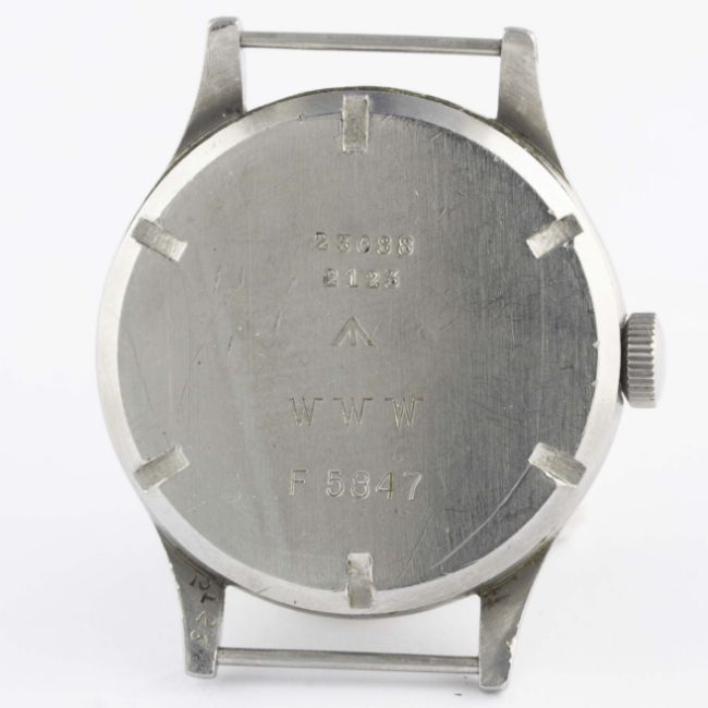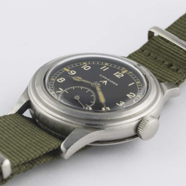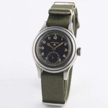 A RARE GENTLEMAN'S STAINLESS STEEL BRITISH MILITARY LONGINES W.W.W. WRIST WATCH CIRCA 1940s, PART OF THE "DIRTY DOZEN"Movement: 15J, manual wind, cal. 12.68Z, signed Longines, numbered.Case: Diameter approx. 38mm, fixed bars, screw back, issue markings 23088 2123 ^ WWW F5847, lug numbered 2123.Strap: NATO. CONDITION REPORTDial: Original dial in excellent condition.Movement: Working at present.Case: In good condition, with scratches due to use.Strap/Bracelet: In excellent condition.