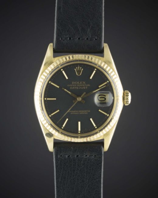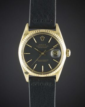 A RARE GENTLEMAN'S 18K SOLID GOLD ROLEX OYSTER PERPETUAL DATEJUST WRIST WATCHCIRCA 1965, REF. 1601 WITH MATT BLACK DIALMovement: 26J, automatic chronometer, cal. 1570, signed Montres Rolex S.A., numbered.Case: Diameter approx. 36mm, Oyster case, signed Montres Rolex S.A., numbered, 18k hallmarks, fluted bezel, Rolex crown.Strap: Leather. CONDITION REPORTDial: Original dial in excellent condition.Movement: Working at present.Case: In very good condition, with light scratches due to general use.Strap/Bracelet: In excellent condition.