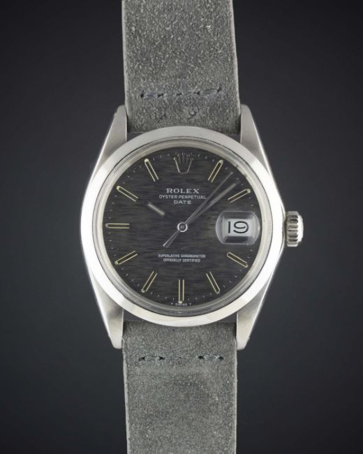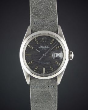 A GENTLEMAN'S STAINLESS STEEL ROLEX OYSTER PERPETUAL DATE WRIST WATCHCIRCA 1971, REF. 1500 WITH GREY "SLATE" DIALMovement: 26J, automatic chronometer, cal. 1570, signed Montres Rolex S.A., numbered.Case: Diameter approx. 35mm, Oyster case, signed Montres Rolex S.A., dated III.71, numbered, Rolex crown.Strap: Suede. CONDITION REPORTDial: Original dial in excellent condition.Movement: Working at present.Case: In excellent condition, with some small scratches due to general use.Strap/Bracelet: In excellent condition.