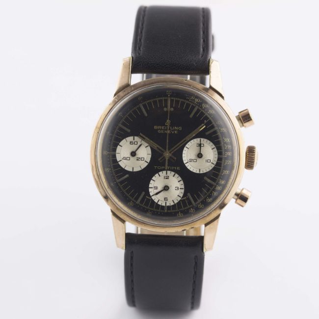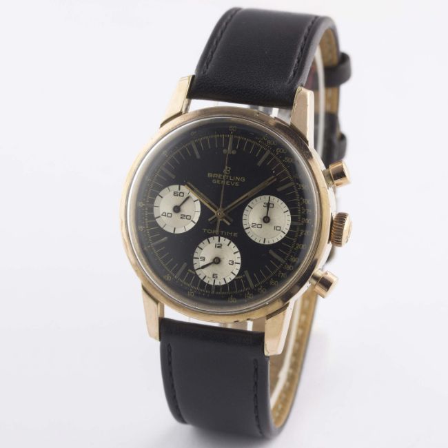 A GENTLEMAN'S PINK GOLD PLATED BREITLING TOP TIME CHRONOGRAPH WRIST WATCH CIRCA 1968, REF. 810 WITH "REVERSE PANDA" DIALMovement: 17J, manual wind, Venus cal. 178, signed Breitling Watch Ltd.Case: Diameter approx. 38mm, steel snap back, signed Breitling, numbered, Breitling crown. Strap: Leather. CONDITION REPORTDial: Original dial in very good condition, showing some small signs of age.Movement: Working at present.Case: In very good condition, with some light scratches & wear due to general use.Strap/Bracelet: In very good condition.