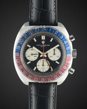 A RARE GENTLEMAN'S STAINLESS STEEL NIVADA GRENCHEN GMT CHRONOGRAPH WRIST WATCH CIRCA 1970, REF. 85009Movement: 17J, manual wind, Valjoux cal. 724, signed Nivada.Case: Width approx. 43mm, screw back, signed Nivada Grenchen, numbered, 24 hour rotating "Pepsi" bezel, Nivada crown.Strap: Leather.    CONDITION REPORTDial: Original dial in excellent condition, registers showing some small signs of age. Movement: Working at present. Case: In good condition, with small scratches due to general use, some wear to bezel insert between 23 & 24 hour markers. Strap/Bracelet: In excellent condition.