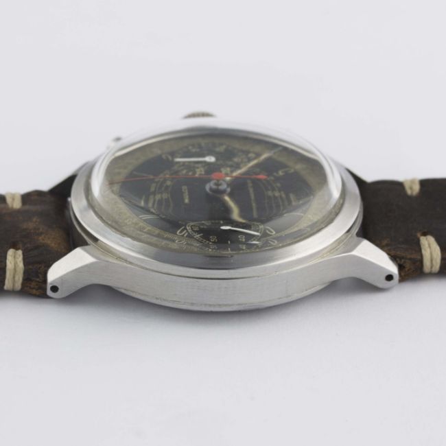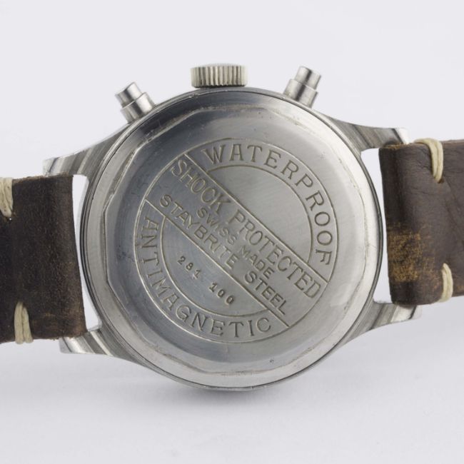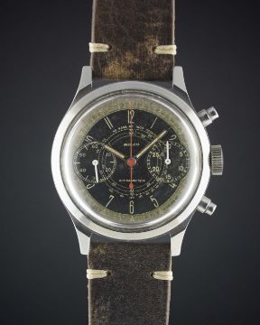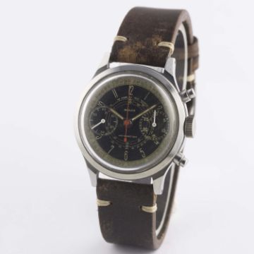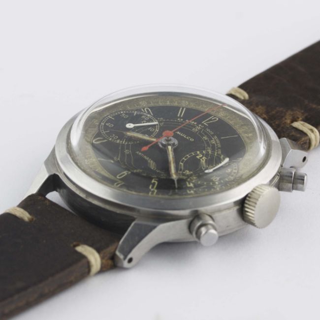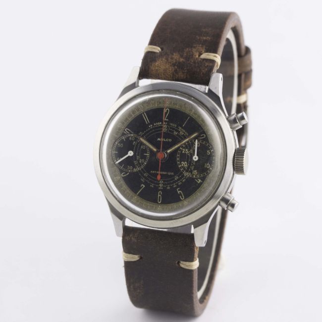 A VERY RARE GENTLEMAN'S LARGE SIZE STAINLESS STEEL MULCO ANTIMAGNETIC WATERPROOF CHRONOGRAPH WRIST WATCHCIRCA 1940s, WITH SPILLMAN CASE & TWO TONE "TROPICAL" DIALMovement: 17J, manual wind, Valjoux cal. 22, signed Mulco Extra. Case: Diameter approx. 38mm, screw back, signed Mulco S.A., numbered, faceted lugs, "inverted" pushers. Strap: Leather. CONDITION REPORTDial: Original dial in good "tropical" condition, showing signs of age.Movement: Working at present.Case: In excellent condition, with some light scratches due to general use.Strap/Bracelet: In excellent condition.