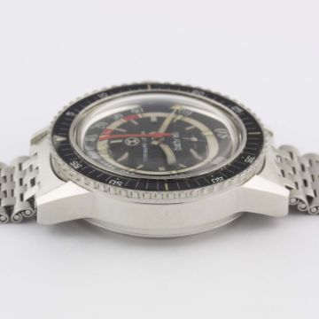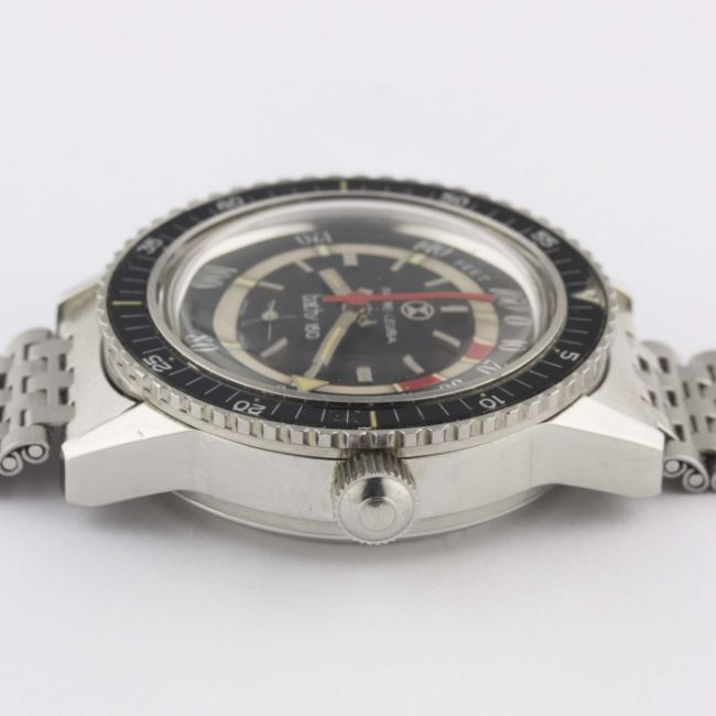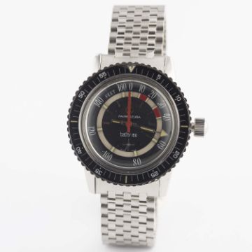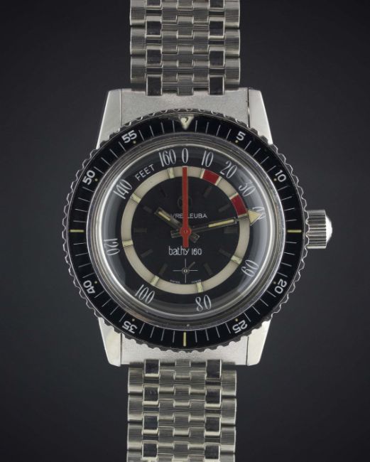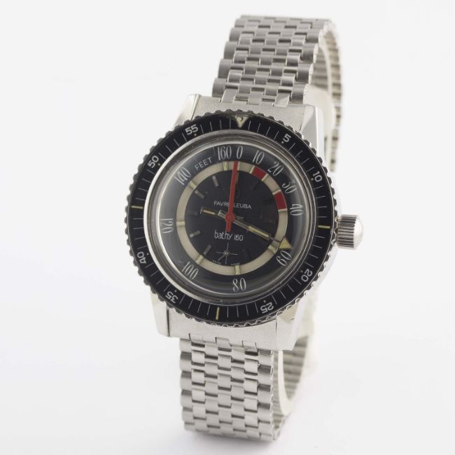 A VERY RARE GENTLEMAN'S STAINLESS STEEL FAVRE LEUBA BATHY 160 DEPTH GAUGE DIVERS BRACELET WATCH CIRCA 1968, REF. 53243 Movement: 17J, manual wind, signed Favre-Leuba. Case: Diameter approx. 40mm, screw back, pressure diaphragm inside allowing for indication of depth rating whilst diving with red hand corresponding to dial, signed Favre-Leuba with emblem embossed on case back, numbered, 60 minute rotating bakelite bezel, Favre-Leuba screw-down crown.Bracelet: Original Favre-Leuba NSA bracelet. CONDITION REPORTDial: Original dial in excellent condition, some light ageing to inner silver ring.Movement: Working at present.Case: In excellent condition, with light scratches due to general use, slight wear to underside of bakelite bezel at 12 o'clock.Strap/Bracelet: In excellent condition, with some light scratches due to general use.