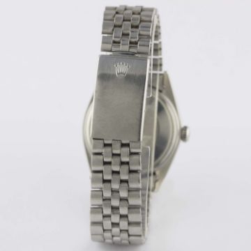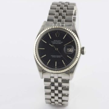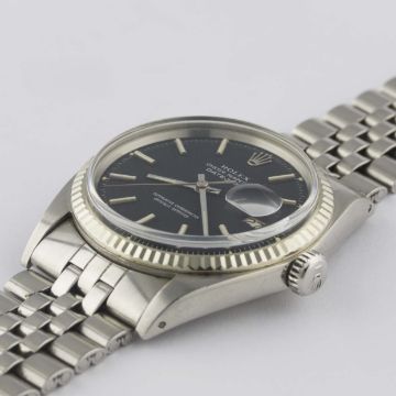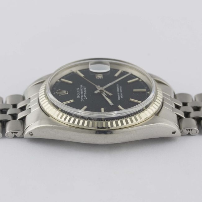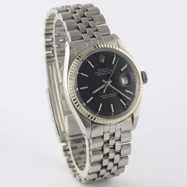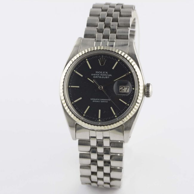 A RARE GENTLEMAN'S STEEL & WHITE GOLD ROLEX OYSTER PERPETUAL DATEJUST BRACELET WATCHCIRCA 1971, REF. 1601 WITH MATT BLACK "RED FLECK" DIALMovement: 26J, automatic chronometer, cal. 1570, signed Montres Rolex S.A., numbered.Case: Diameter approx. 36mm, Oyster case, signed Montres Rolex S.A., dated IV.71, numbered, solid white gold fluted bezel, Rolex crown.Bracelet: Original Rolex Jubilee bracelet, numbered 6251H/55, dated 4.71. CONDITION REPORTDial: Original dial in excellent condition.Movement: Working at present.Case: In very good condition, with light scratches due to general use.Strap/Bracelet: In good condition, with light scratches due to general use.