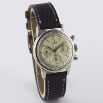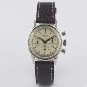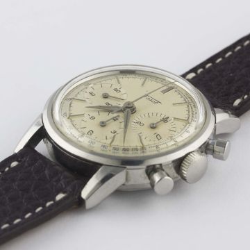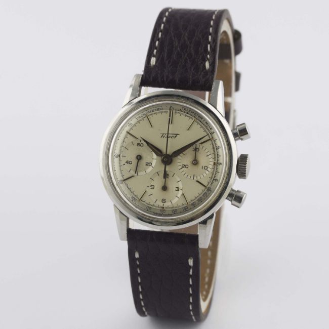 A GENTLEMAN'S STAINLESS STEEL TISSOT CHRONOGRAPH WRIST WATCH CIRCA 1960s, WITH TWO TONE SILVER DIAL & "ALPHA" HANDSMovement: 17J, manual wind, Lemania cal. 1281, signed CHs Tissot & Fils, numbered. Case: Diameter approx. 33mm, screw back, signed Tissot, numbered.Strap: Leather. CONDITION REPORTDial: Original dial in very good condition, showing some small signs of age, small mark to dial just above centre.Movement: Working at present.Case: In excellent condition, with some small scratches due to general use.Strap/Bracelet: In excellent condition.