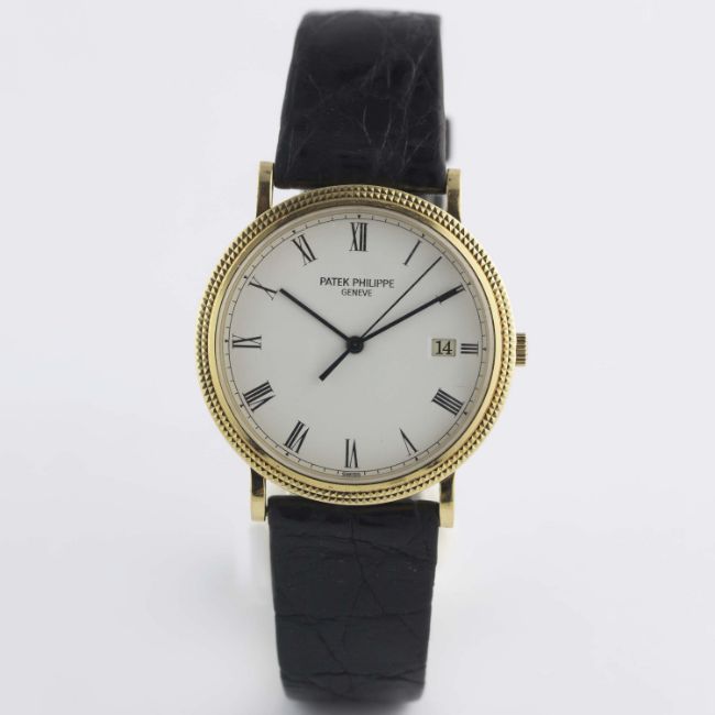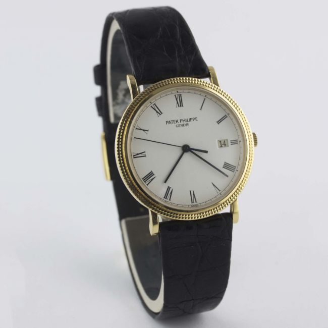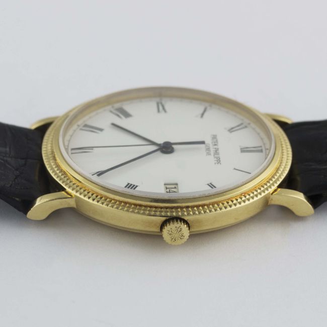 A GENTLEMAN'S 18K SOLID GOLD PATEK PHILIPPE CALATRAVA WRIST WATCHCIRCA 1990s, REF. 3944Movement: 7J, quartz, cal. E23 SC, signed Patek Philippe, numbered.Case: Diameter approx. 33mm, snap back, signed Patek Philippe, numbered, 18k hallmarks, "Clous de Paris" bezel, Patek Philippe crown. Strap: Patek Philippe leather strap & 18k solid gold pin buckle. CONDITION REPORTDial: Original dial in excellent condition.Movement: Working at present.Case: In excellent condition, with light scratches due to general use.Strap/Bracelet: In good condition.