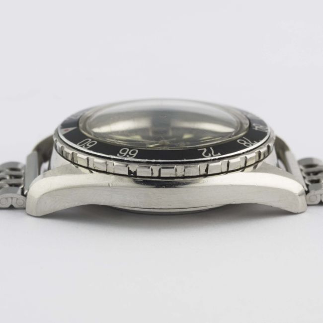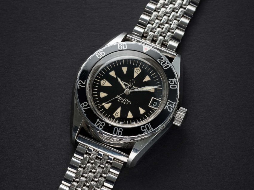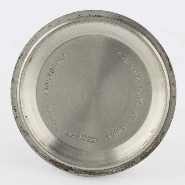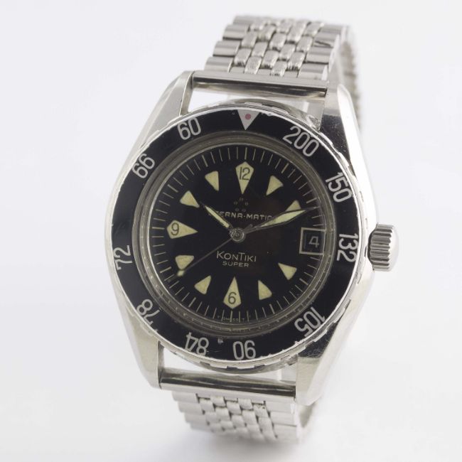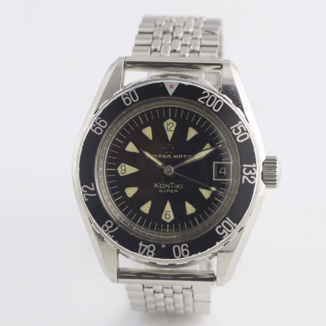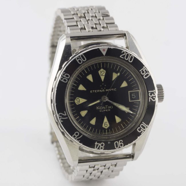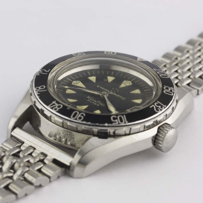 A RARE GENTLEMAN'S STAINLESS STEEL ETERNA MATIC SUPER KONTIKI BRACELET WATCHCIRCA 1960s, REF. 130 FTP-3 WITH GLOSS BLACK GILT DIAL & DECOMPRESSION LIMIT BEZELMovement: Automatic, cal. 1489K, signed Eterna Matic, numbered.Case: Diameter approx. 40mm, screw back, solid gold Kontiki emblem embossed on case back, signed Eterna Watch Co, decompression limit rotating bezel (measured in feet), screw-down crown.Bracelet: Prima-Plana "beads of rice" bracelet. CONDITION REPORTDial: Original dial in excellent condition.Movement: Working at present.Case: In excellent condition, with some small scratches due to general use.Strap/Bracelet: In excellent condition.