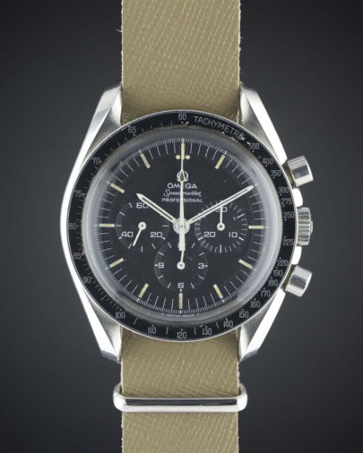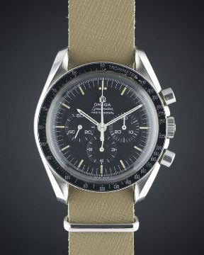 A RARE GENTLEMAN'S STAINLESS STEEL OMEGA SPEEDMASTER PROFESSIONAL CHRONOGRAPH WRIST WATCH CIRCA 1970, REF. 145022-69 ST WITH "220 MISPRINT" BEZELMovement: 17J, manual wind, cal. 861, signed Omega, numbered.Case: Diameter approx. 42mm, screw back, Speedmaster emblem on case back, signed Omega Watch Co, dust cover, "220 misprint" tachymetre bezel, Omega crown.Strap: Leather NATO. CONDITION REPORTDial: Original dial in excellent condition.Movement: Working at present.Case: In excellent condition, with some light scratches due to general use.Strap/Bracelet: In excellent condition.