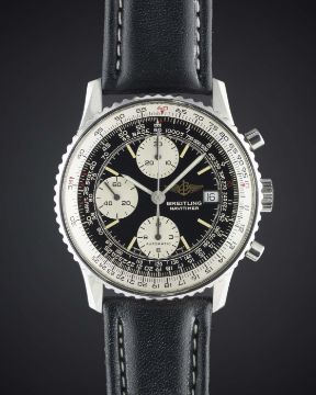 A GENTLEMAN'S STAINLESS STEEL BREITLING "OLD NAVITIMER" AUTOMATIC CHRONOGRAPH WRIST WATCH DATED 1992, REF. A13019 ACCOMPANIED BY THE ORIGINAL BOX, GUARANTEE, BOOKLETS AND SERVICE BOOKLET WITH SERVICE STAMPS FROM 1996 AND 2004Movement: Automatic, signed Breitling.Case: Diameter approx. 41mm, signed Breitling, numbered, slide rule bezel, Breitling crown.Strap: Leather strap with Breitling deployment clasp. CONDITION REPORTDial: Original dial in excellent condition.Movement: Working at present.Case: In excellent condition, with some light scratches due to general use.Strap/Bracelet: In good condition.