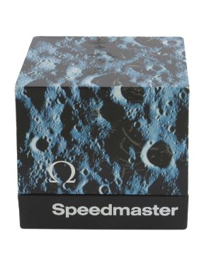 A VERY RARE OMEGA SPEEDMASTER PROFESSIONAL MOON CRATER BOX CIRCA 1970, FOR REF. 145.022-69 / -69 SW WITH ORIGINAL RETAILER HOFFMAN BAD CANNSTATT STICKER STILL APPLIED ON THE BASEBox: Measures approx. 89mm by 89mm by 81mm when closed, white corduroy inner lining & watch stand. CONDITION REPORTBox: Original in very good condition.