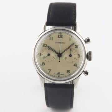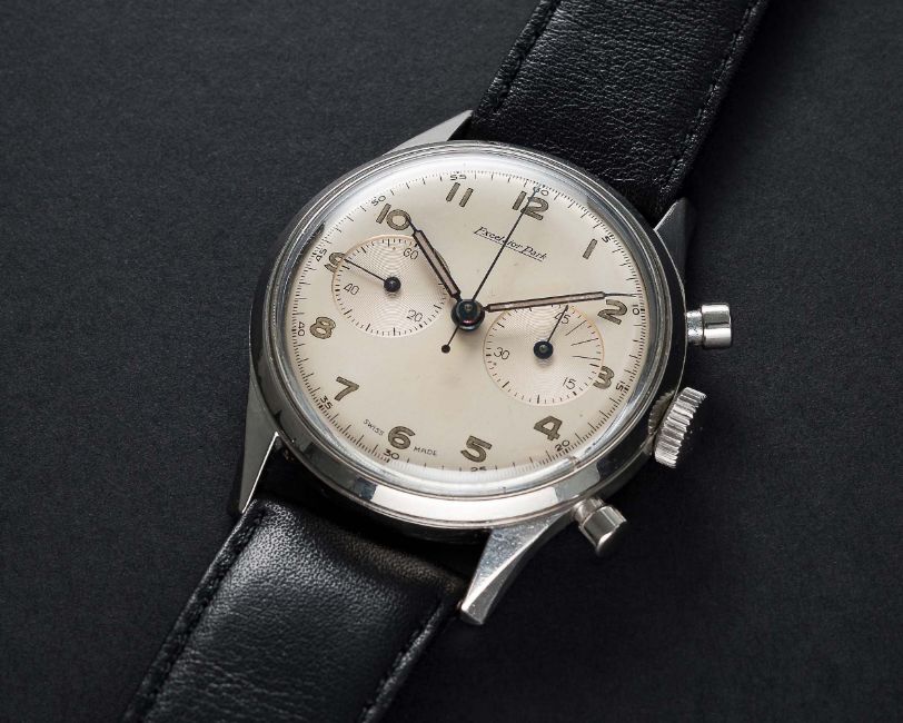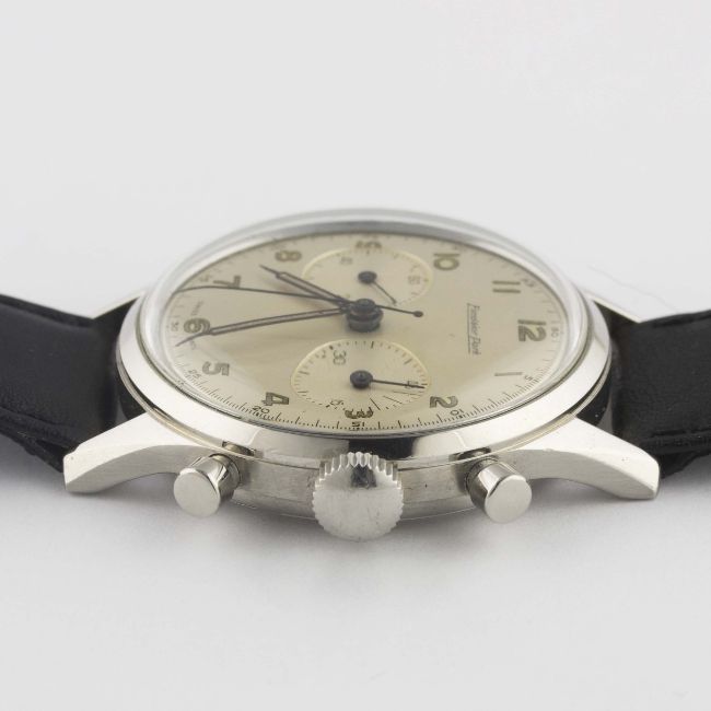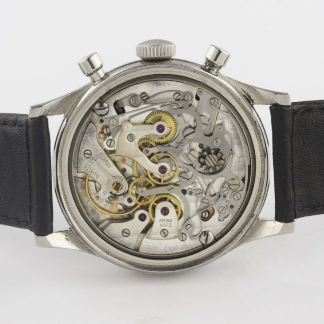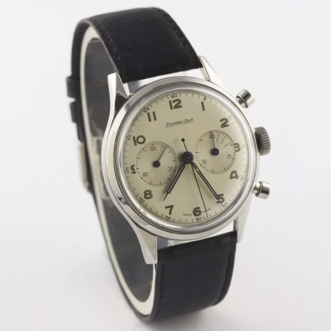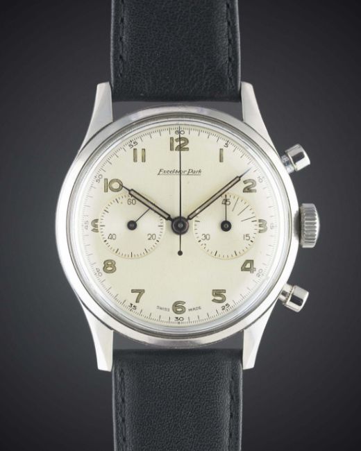 A VERY RARE GENTLEMAN'S LARGE SIZE STAINLESS STEEL SWEDISH MILITARY ROYAL NAVY EXCELSIOR PARK "WATERPROOF" CHRONOGRAPH WRIST WATCH CIRCA 1950sMovement: Manual wind, Excelsior Park calibre.Case: Diameter approx. 37mm, "bevelled" screw back, issue markings 94 with three Swedish Military Crowns (Tre Kronor), numbered.Strap: Leather. CONDITION REPORTDial: Original dial in excellent condition.Movement: Working at present.Case: In excellent condition, with some small scratches due to general use.Strap/Bracelet: In very good condition.