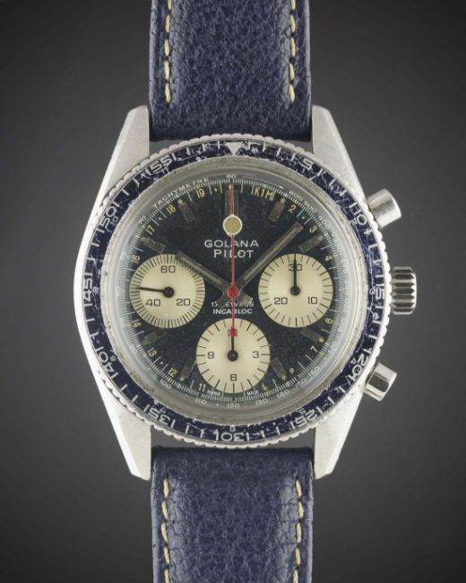 A GENTLEMAN'S STAINLESS STEEL GOLANA PILOT CHRONOGRAPH WRIST WATCH CIRCA 1970, WITH BLUE DIAL & BEZELMovement: 17J, manual wind, Valjoux cal. 726.Case: Diameter approx. 39mm, screw back, numbered, MH rotating bezel.Strap: Leather. CONDITION REPORTDial: Original dial in good condition, showing signs of age.Movement: Working at present.Case: In good condition, with scratches due to general use, some wear to bezel.Strap/Bracelet: In poor condition.