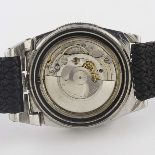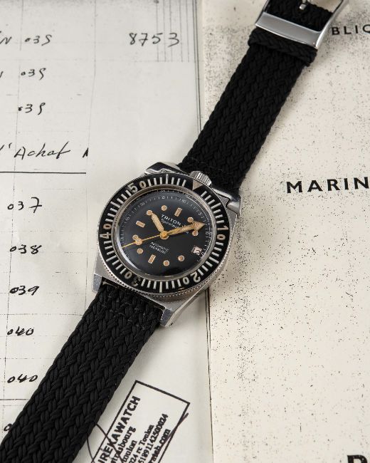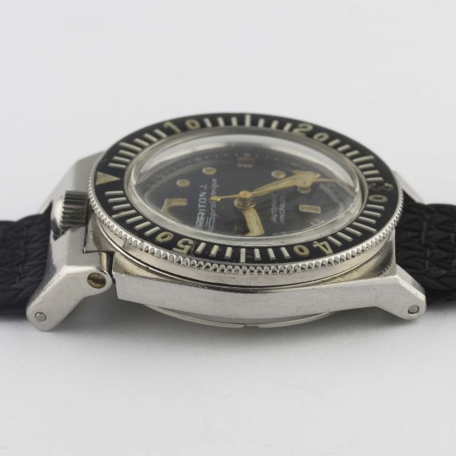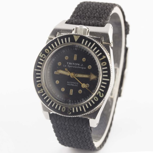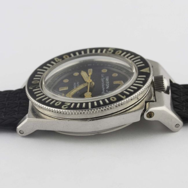 A VERY RARE GENTLEMAN'S STAINLESS STEEL FRENCH MILITARY MARINE NATIONALE TRITON J. LA SPIROTECHNIQUE AUTOMATIC DIVERS WRIST WATCH CIRCA 1960s, ACCOMPANIED BY A CERTIFIED EXTRACT OF THE ORIGINAL MARINE NATIONALE LEDGER (MARINE NATIONALE REGISTRE POUR LA COMPTABILITÉ DES DIVERS CHAPITRES) SHOWING THE WATCH WITH ITS UNIQUE NUMBER MATCHING CASE BACKMovement: 25J, automatic, ETA cal. 2472.Case: Width approx. 39mm, screw back, hinged top lugs to form crown guard, diving scene engraved on case back with four digit number matching MN ledger, patent numbers to inside case back, 60 minute rotating bakelite bezel, screw-down crown.Strap: Perlon. CONDITION REPORTDial: Original dial in excellent condition, showing some very small signs of age.Movement: Working at present.Case: In very good condition, with small scratches due to use.Strap/Bracelet: In excellent condition.