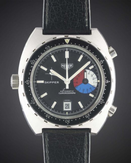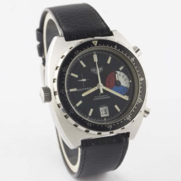 A GENTLEMAN'S STAINLESS STEEL HEUER SKIPPER AUTOMATIC CHRONOGRAPH WRIST WATCHCIRCA 1980s, REF. 15640 (11063V) WITH BLACK DIAL & BEZEL, ACCOMPANIED BY HEUER BOXMovement: 17J, automatic, cal. 15, signed Heuer.Case: Width approx. 42mm, screw back, signed Heuer-Leonidas SA, numbered, MH rotating bezel, Heuer crown & pushers.Strap: Leather. CONDITION REPORTDial: Original dial in excellent condition.Movement: Working at present.Case: In excellent condition, with some small scratches due to general use.Strap/Bracelet: In excellent condition.