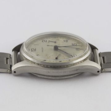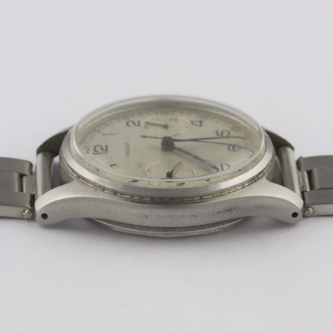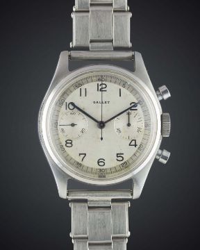A GENTLEMAN'S STAINLESS STEEL GALLET "WATERPROOF" CHRONOGRAPH BRACELET WATCH CIRCA 1950, WITH TWO TONE SILVER DIAL Movement: 17J, manual wind, signed Gallet & Co.Case: Diameter approx. 36mm, screw back, signed Gallet & Co, numbered, dust cover.Bracelet: Riveted "Oyster" bracelet. CONDITION REPORTDial: Original dial in good condition, showing some signs of age.Movement: Working at present.Case: In excellent condition, with light scratches due to general use.Strap/Bracelet: In excellent condition, with some small scratches.
