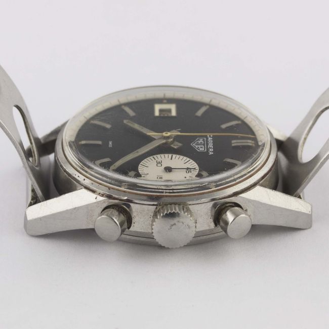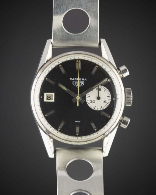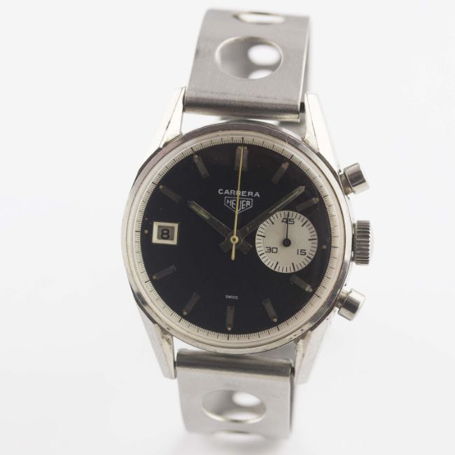 A VERY RARE GENTLEMAN'S STAINLESS STEEL HEUER CARRERA "DATO 45" CHRONOGRAPH BRACELET WATCH CIRCA 1968, REF. 3147NMovement: 17J, manual wind, Landeron cal. 189, signed Heuer-Leonidas SA.Case: Diameter approx. 36mm, screw back, signed Heuer-Leonidas SA, numbered, inscription to case back.Bracelet: Perforated metal bracelet. CONDITION REPORTDial: Original dial in excellent condition.Movement: Working at present.Case: In excellent condition, with light scratches due to general use, some small scratches to case back due to general use.Strap/Bracelet: In good condition, with light scratches & some wear due to general use.
