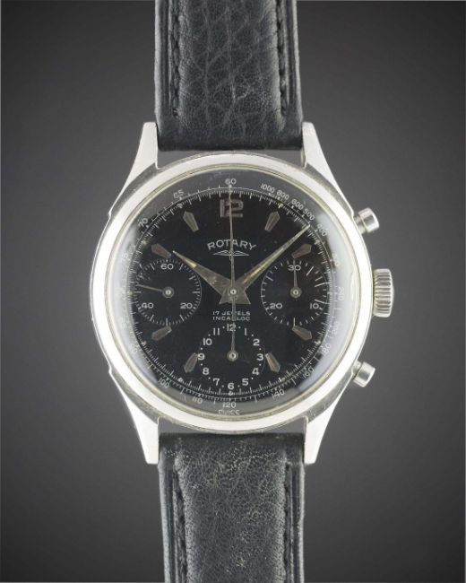 A GENTLEMAN'S STAINLESS STEEL ROTARY CHRONOGRAPH WRIST WATCH CIRCA 1960s, REF. 155 72 WITH GLOSS BLACK DIALMovement: 17J, manual wind, Valjoux cal. 72.Case: Diameter approx. 35mm, screw back, "mini" pushers.Strap: Leather. CONDITION REPORTDial: Original dial in excellent condition, showing some small signs of age.Movement: Working at present.Case: In good condition, with scratches due to general use.Strap/Bracelet: In excellent condition.