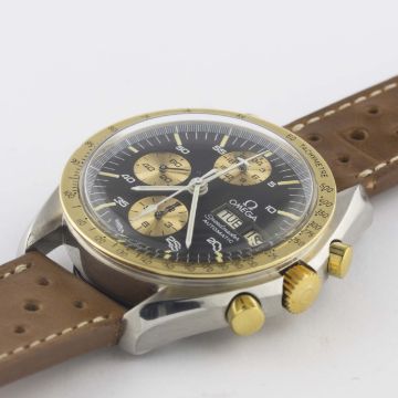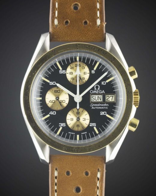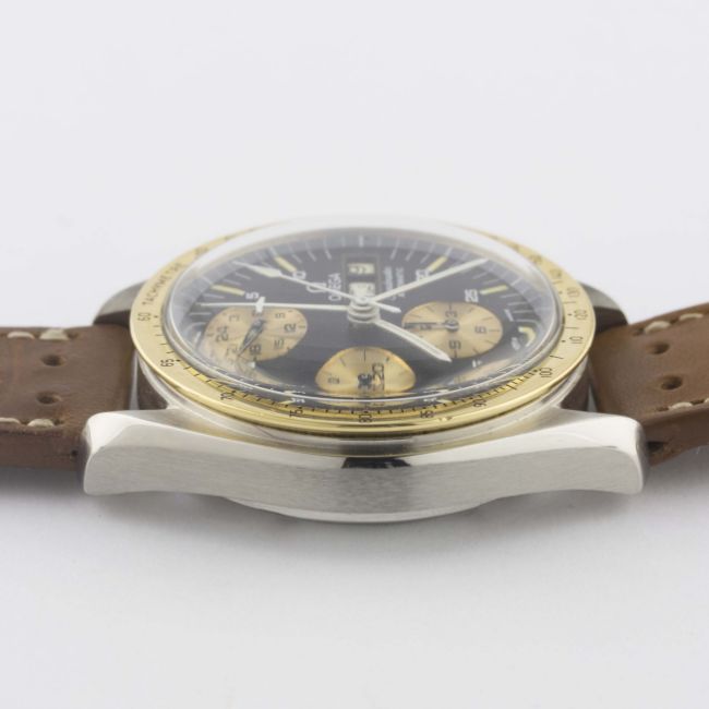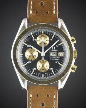 A VERY RARE GENTLEMAN'S STEEL & GOLD OMEGA SPEEDMASTER PROFESSIONAL "HOLY GRAIL" AUTOMATIC CHRONOGRAPH WRIST WATCH CIRCA 1988, REF. ST 376.0822 SOMETIMES REFERRED TO AS THE "ULTRA HOLY GRAIL" OR "LIBERACE GRAIL", LIMITED EDITION OF 200 PIECES FOR THE ITALIAN MARKET WITH LIMITED EDITION NUMBER ENGRAVED ON CASE BACK, FROM AN UNDOCUMENTED BATCH OF MOVEMENT SERIAL NUMBERS Movement: 17J, automatic, cal. 1045, signed Omega, numbered 41,XXX,XXX.Case: Diameter approx. 42mm, screw back, Speedmaster emblem embossed, signed Omega Watch Co. C.R.S., solid gold tachymetre bezel, Omega crown.Strap: Perforated leather. CONDITION REPORTDial: Original dial in excellent condition, showing some very small signs of age.Movement: Working at present.Case: In excellent condition, with some light scratches due to general use.Strap/Bracelet: In excellent condition.