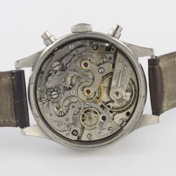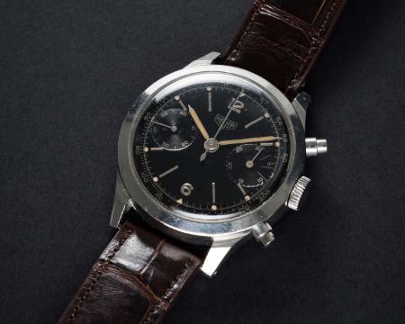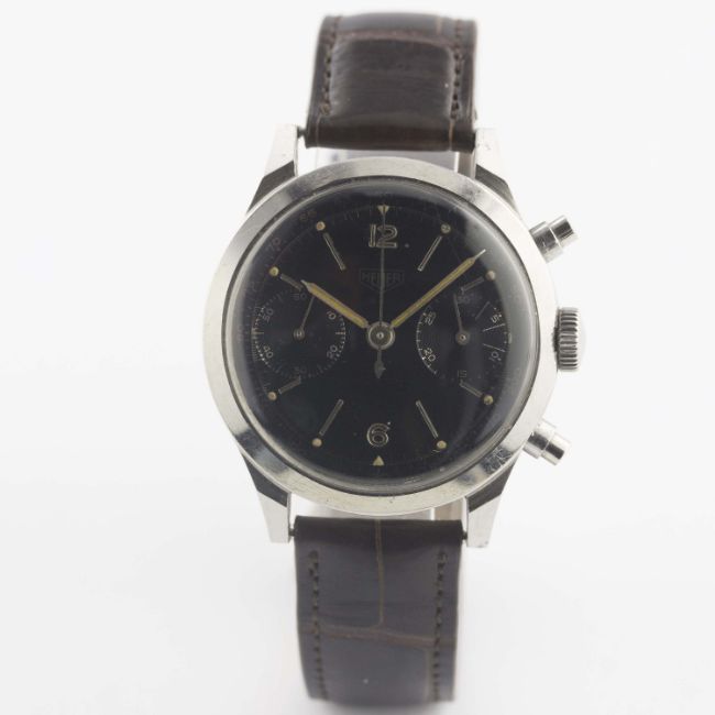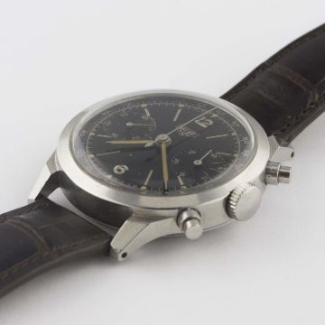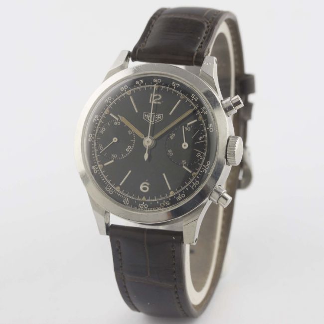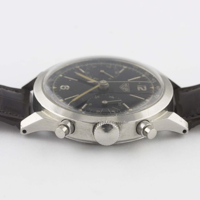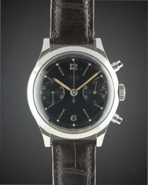 A VERY RARE GENTLEMAN'S LARGE SIZE STAINLESS STEEL HEUER ANTIMAGNETIC WATERPROOF CHRONOGRAPH WRIST WATCHCIRCA 1940s, REF. 281H100 POSSIBLE PROTOTYPE, WITH SPILLMAN CASE & GLOSS BLACK DIAL Movement: 17J, manual wind, signed Heuer, numbered matching case back. Case: Diameter approx. 38mm, screw back, numbered matching movement, faceted lugs, "inverted" pushers. Strap: Leather. CONDITION REPORTDial: Original dial in very good condition, showing some signs of age.Movement: Working at present.Case: In very good condition, with some small scratches due to general use.Strap/Bracelet: In good condition.