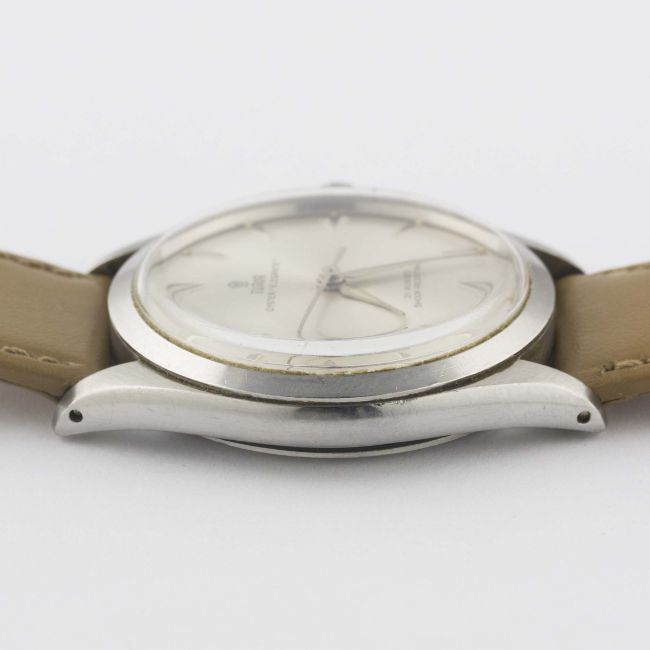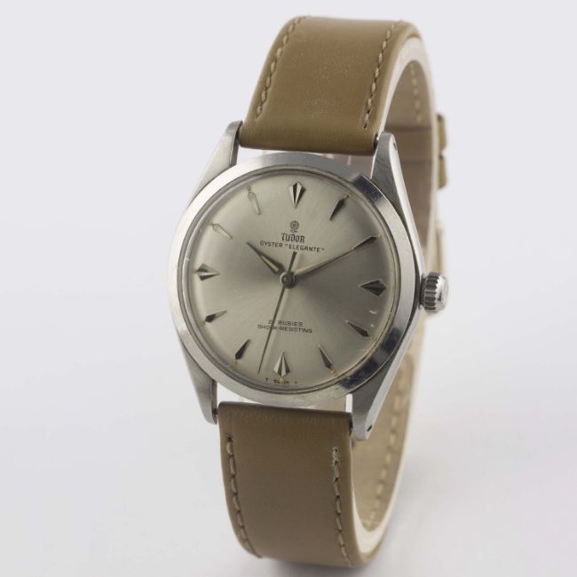 A GENTLEMAN'S STAINLESS STEEL ROLEX TUDOR OYSTER ELEGANTE WRIST WATCHCIRCA 1963, REF. 7960Movement: 21J, manual wind, cal. 2402, signed Tudor.Case: Diameter approx. 34.5mm, Oyster case, signed Montres Tudor S.A., dated I.63, numbered, Rolex crown. Strap: Leather. CONDITION REPORTDial: Original dial in very good condition, some light hand drag near centre.Movement: Working at present.Case: In very good condition, with some light scratches due to general use.Strap/Bracelet: In excellent condition.