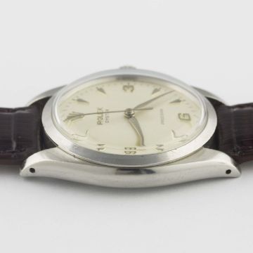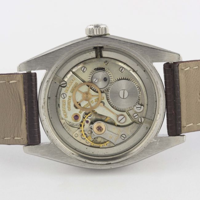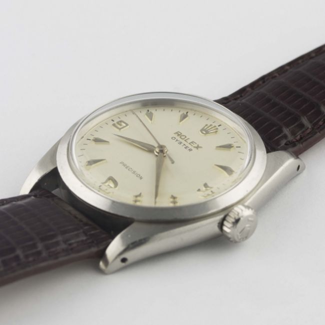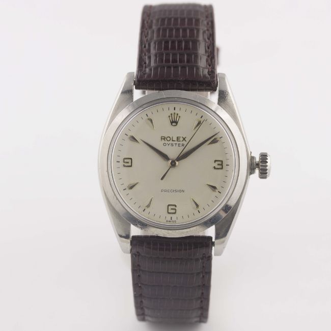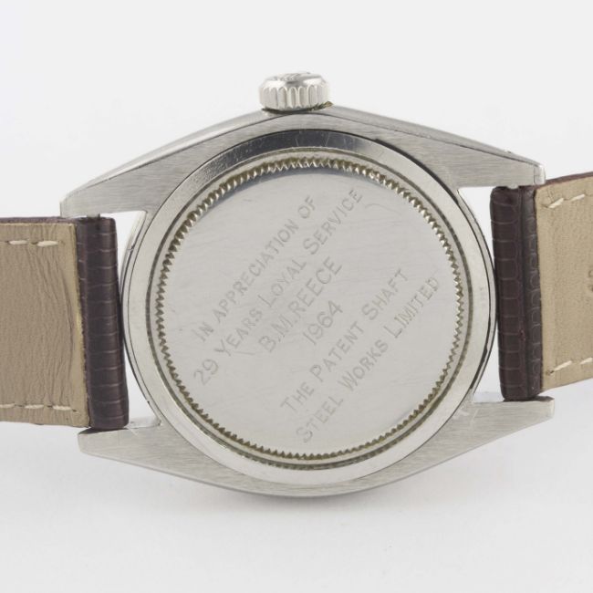 A GENTLEMAN'S STAINLESS STEEL ROLEX OYSTER PRECISION WRIST WATCHDATED 1964, REF. 6426 WITH 3-6-9 DIAL, ACCOMPANIED BY THE ORIGINAL ROLEX BOX MARKED WITH 'PATENT SHAFT STEEL WORKS' LOGO & DATED 1964 MATCHING PRESENTATIONAL INSCRIPTION TO CASE BACKMovement: 17J, manual wind, cal. 1210, signed Montres Rolex S.A, numbered.Case: Diameter approx. 34mm, Oyster case, signed Montres Rolex S.A., dated I.63, numbered, Patent Shaft Steel Works presentational inscription for 29 years of loyal service in 1964, Rolex crown.Strap: Leather. CONDITION REPORTDial: Original dial in very good condition, showing some small signs of age.Movement: Working at present.Case: In good condition, with scratches due to general use.Strap/Bracelet: In excellent condition.