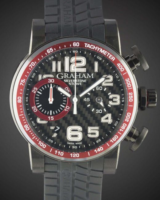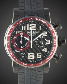 A GENTLEMAN'S PVD COATED STAINLESS STEEL GRAHAM SILVERTONE STOWE CHRONOGRAPH WRIST WATCHDATED 2017, REF. NM-2SAAB-1 WITH ORIGINAL BOX & GUARANTEEMovement: 59J, automatic, cal. G1702 signed Graham.Case: Diameter approx. 44mm, exhibition back, signed Graham, numbered, original screw-down crown & oversized pushers.Strap: Original Graham rubber tyre strap & PVD coated pin buckle. CONDITION REPORTDial: Original dial in excellent condition.Movement: Working at present.Case: In excellent condition.Strap/Bracelet: In excellent condition.