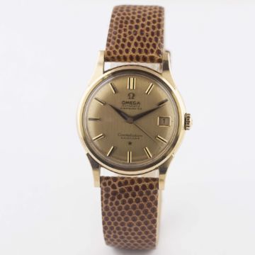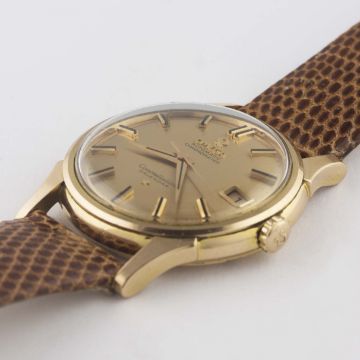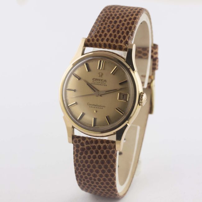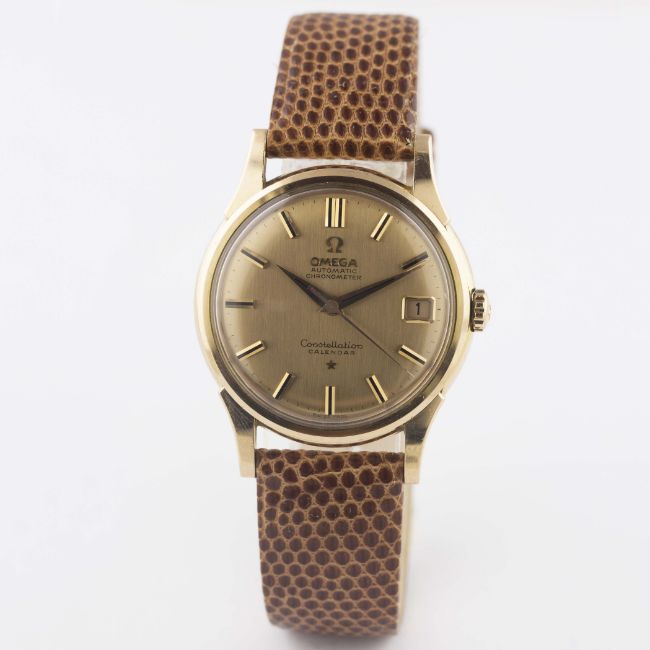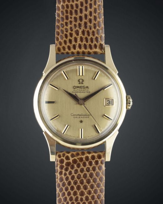 A FINE GENTLEMAN'S 18K SOLID PINK GOLD OMEGA CONSTELLATION AUTOMATIC CHRONOMETER CALENDAR WRIST WATCH DATED 1961, REF. 14393/4 SC 2 WITH PINK GOLD BRUSHED DIAL, ACCOMPANIED BY THE ORIGINAL BOX & PAPERS Movement: 24J, automatic chronometer, cal. 561, signed Omega Watch Co., numbered.  Case: Diameter approx. 34mm, screw back, Constellation badge embossed on case back, signed Omega Watch Co, 18k hallmarks, Omega crown. Strap: Leather. CONDITION REPORTDial: Original dial in excellent condition.Movement: Working at present.Case: In excellent condition, with some light scratches due to general use.Strap/Bracelet: In excellent condition.