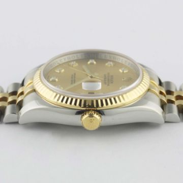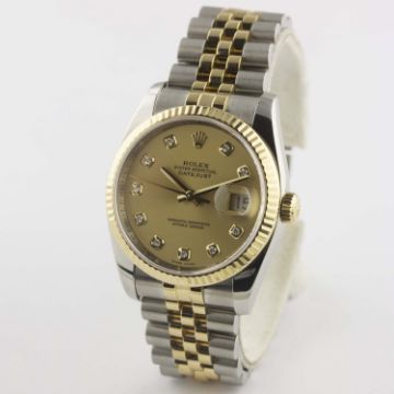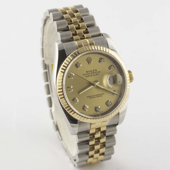 A GENTLEMAN'S SIZE STEEL & GOLD ROLEX OYSTER PERPETUAL DATEJUST BRACELET WATCHDATED 2007, REF. 116233 WITH ORIGINAL CHAMPAGNE DIAMOND DOT DIAL, ACCOMPANIED BY THE ORIGINAL BOX, GUARANTEE & BOOKLETSMovement: 31J, automatic chronometer, cal. 3135, signed Rolex Geneva, numbered.Case: Diameter approx. 36mm, Oyster case, signed Montres Rolex Geneva, M serial no., 18k solid gold fluted bezel, sapphire crystal, Rolex crown.Bracelet: Original Rolex Jubilee steel & 18k solid gold bracelet. CONDITION REPORTDial: Original dial in excellent condition.Movement: Working at present.Case: In excellent condition.Strap/Bracelet: In excellent condition.