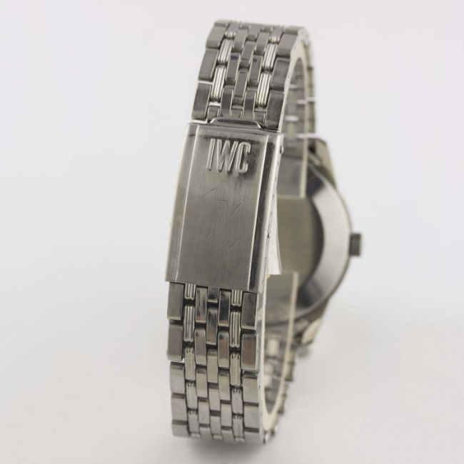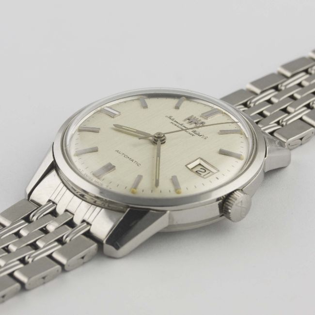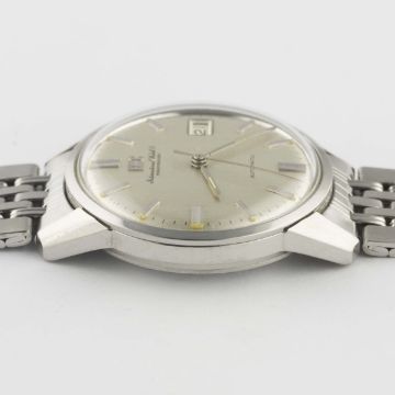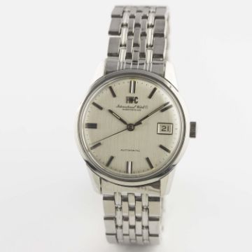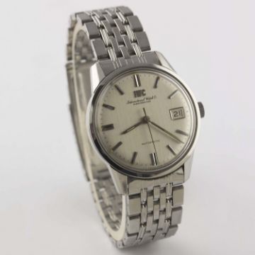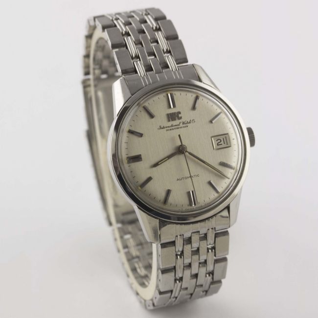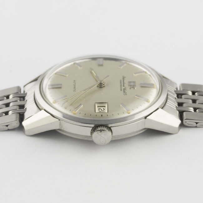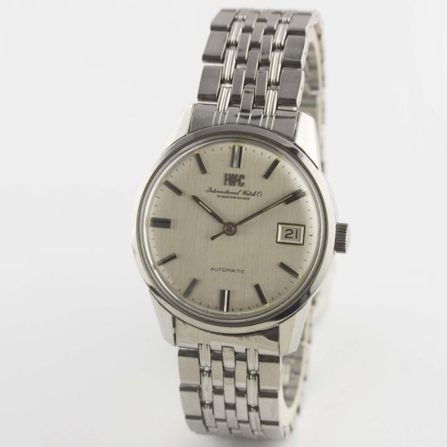 A GENTLEMAN'S STAINLESS STEEL IWC AUTOMATIC BRACELET WATCH CIRCA 1969, WITH BRUSHED SILVER DIAL Movement: Automatic, signed International Watch Co, numbered. Case: Diameter approx. 35mm, signed International Watch Co, numbered, IWC crown. Bracelet: Original IWC "BoR" GF bracelet, dated 4.69. CONDITION REPORTDial: Original dial in excellent condition.Movement: Working at present.Case: In excellent condition, with some light scratches due to general use.Strap/Bracelet: In very good condition, with some scratches due to general use.