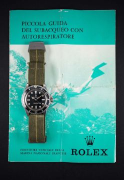 A RARE GENTLEMAN'S STAINLESS STEEL ROLEX OYSTER PERPETUAL SUBMARINER WRIST WATCHCIRCA 1969, REF. 5513 WITH "METERS FIRST" MATT DIAL, ACCOMPANIED BY ROLEX MARINE NATIONALE DIVING PAMPHLET (PICCOLA GUIDA DEL SUBACQUEO CON AUTORESPIRATORE) Movement: 26J, automatic, cal. 1520, signed Rolex Geneva.Case: Diameter approx. 40mm, Oyster case, signed Montres Rolex S.A., dated IV.68, numbered, 60 minute rotating "fat font" bezel, Rolex triplock crown.Strap: MN style strap. CONDITION REPORTDial: Original dial in excellent condition.Movement: Working at present.Case: In excellent condition, with small scratches due to general use.Strap/Bracelet: In excellent condition.