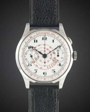 A RARE GENTLEMAN'S STAINLESS STEEL ULYSSE NARDIN SINGLE BUTTON CHRONOGRAPH WRIST WATCH CIRCA 1930s, WITH ENAMEL DIALMovement: Manual wind, signed Ulysse Nardin Locle, numbered.Case: Diameter approx. 37mm, fixed bars, snap back, signed Ulysse Nardin Locle, numbered.Strap: Leather. CONDITION REPORTDial: Original dial in very good condition, with some hairlines cracks & two small areas of repair to edge.Movement: Working at present.Case: In excellent condition, with some light scratches due to general use.Strap/Bracelet: In excellent condition.
