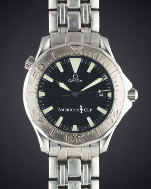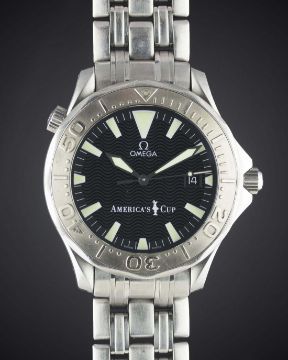 A GENTLEMAN'S STEEL & WHITE GOLD OMEGA SEAMASTER AMERICA'S CUP 300M AUTOMATIC CHRONOMETER BRACELET WATCH CIRCA 2000, REF. 2533.50.00 LIMITED EDITION OF 9999 PIECES, WITH ORIGINAL AMERICA'S CUP BOX (MISSING TOP OF OUTER BOX), CHRONOMETRE CERTIFICATE & OMEGA BOOKLETS Movement: Automatic chronometer, signed Omega, numbered.Case: Diameter approx. 41mm, screw back, Seamaster emblem embossed on case back, signed Omega, numbered, Limited Edition engraved on side, helium escape valve, 60 minute rotating bezel with 18k solid white gold insert, Omega screw-down crowns.Bracelet: Original Omega Seamaster Professional bracelet. CONDITION REPORTDial: Original dial in excellent condition.Movement: Working at present.Case: In excellent condition, with some small scratches due to general use.Strap/Bracelet: In good condition, with scratches due to general use.