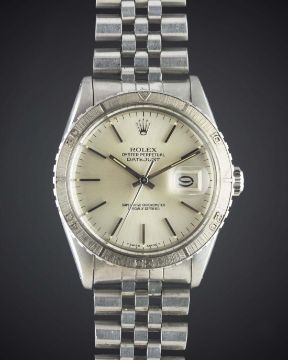 A GENTLEMAN'S STEEL & WHITE GOLD ROLEX OYSTER PERPETUAL DATEJUST "TURNOGRAPH" BRACELET WATCHCIRCA 1979, REF. 16250Movement: 27J, automatic chronometer, quick-set date, cal. 3035, signed Rolex S.A., numbered. Case: Diameter approx. 36mm, Oyster case, signed Montres Rolex S.A., numbered, solid white gold 60 minute rotating "thunderbird" bezel, Rolex crown.Bracelet: Original Rolex Jubilee bracelet, numbered D/62510H/555. CONDITION REPORTDial: Original dial in excellent condition.Movement: Working at present.Case: In very good condition, with light scratches due to general use.Strap/Bracelet: In fair condition, with light scratches due to general use.