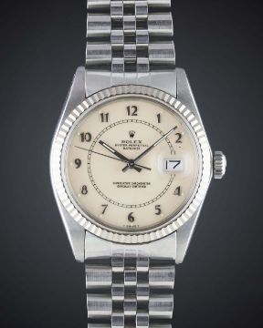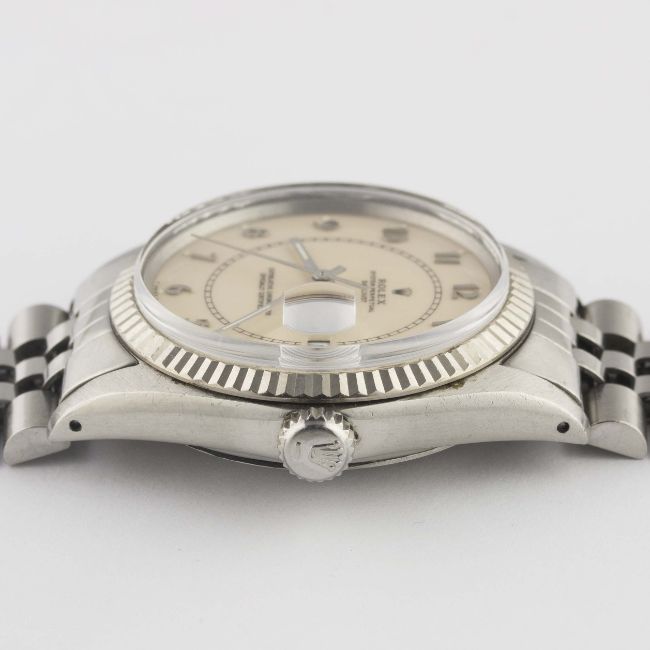 A GENTLEMAN'S STEEL & WHITE GOLD ROLEX OYSTER PERPETUAL DATEJUST BRACELET WATCHCIRCA 1984, REF. 16014 WITH RARE LIGHT PINK LAQUERED "BOILER GAUGE" DIAL Movement: 27J, automatic chronometer, quick-set date, cal. 3035, signed Rolex S.A.Case: Diameter approx. 36mm, Oyster case, signed Montres Rolex S.A., solid white gold fluted bezel, Rolex crown.Bracelet: Rolex Jubilee bracelet, numbered 62510H/555. CONDITION REPORTDial: Original dial in excellent condition.Movement: Working at present.Case: In very good condition, with some light scratches due to general use.Strap/Bracelet: In good condition with some scratches and wear due to general use.