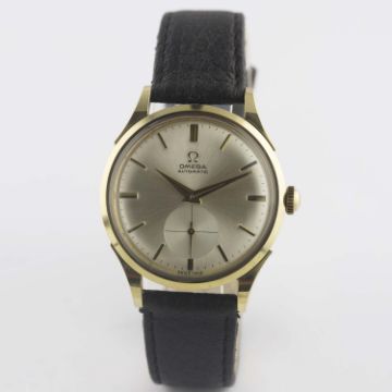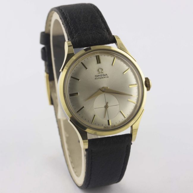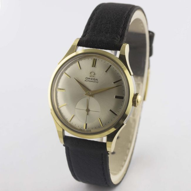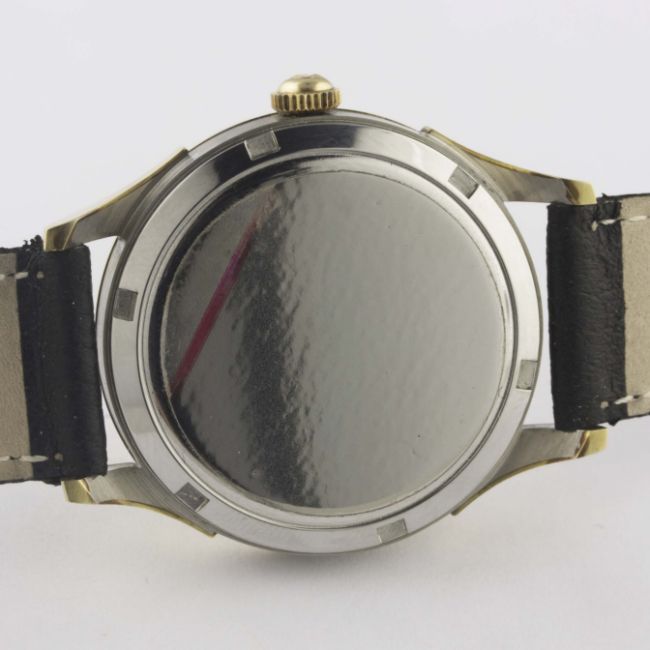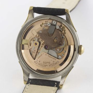A POSSIBLY UNIQUE GENTLEMAN'S STEEL & GOLD CAPPED OMEGA AUTOMATIC PROTOTYPE WRIST WATCH CIRCA 1948-53, REF. 2638-4 CONFIRMED AS A PROTOTYPE BY OMEGA DETAILED IN A COPY OF A LETTER CORRESPONDENCE FROM THE MUSEUM MANAGERMovement: 17J, rose gold plated "bumper" automatic, cal. 30.10 RA, signed Omega Watch Co., five digit serial number.Case: Diameter approx. 35mm, screw back, signed Omega Watch Co, Omega crown.Strap: Leather. CONDITION REPORTDial: Original dial in excellent condition.Movement: Working at present.Case: In excellent condition.Strap/Bracelet: In excellent condition.Overall the watch is in unworn "NOS" condition.
