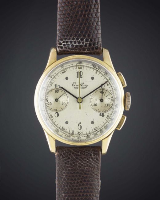A GENTLEMAN'S 18K SOLID GOLD BREITLING PREMIER CHRONOGRAPH WRIST WATCH CIRCA 1945, REF. 789  Movement: Manual wind, Venus calibre, signed Breitling.Case: Diameter approx. 32mm, snap back, numbered, 18k hallmarks. Strap: Leather. CONDITION REPORTDial: Original dial in fair condition, showing signs of age and marks to the surface.Movement: Working at present.Case: In very good condition, with some small scratches due to general use.Strap/Bracelet: In excellent condition.