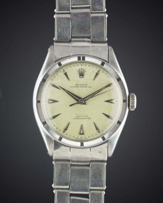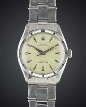 A RARE GENTLEMAN'S STAINLESS STEEL ROLEX OYSTER PERPETUAL BRACELET WATCHCIRCA 1952, REF. 6103 OFFICIALLY CERTIFIED CHRONOMETER WITH SILVER "HONEYCOMB" DIAL AND "RED OFFICIALLY" FADED TO PINK Movement: Automatic "semi bubble back" chronometer, signed Rolex Perpetual, numbered.Case: Diameter approx. 34mm, Oyster case, signed Rolex, numbered, milled bezel, Rolex Super Oyster crown.Bracelet: Rolex Oyster expandable riveted bracelet, numbered 6635/57, dated 2.69. CONDITION REPORTDial: Original dial in very good condition, showing some signs of age & patina.Movement: Working at present.Case: In very good condition, with small scratches due to general use.Strap/Bracelet: In good condition, with light scratches & wear to links due to general use.