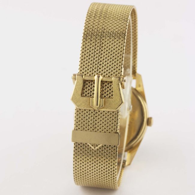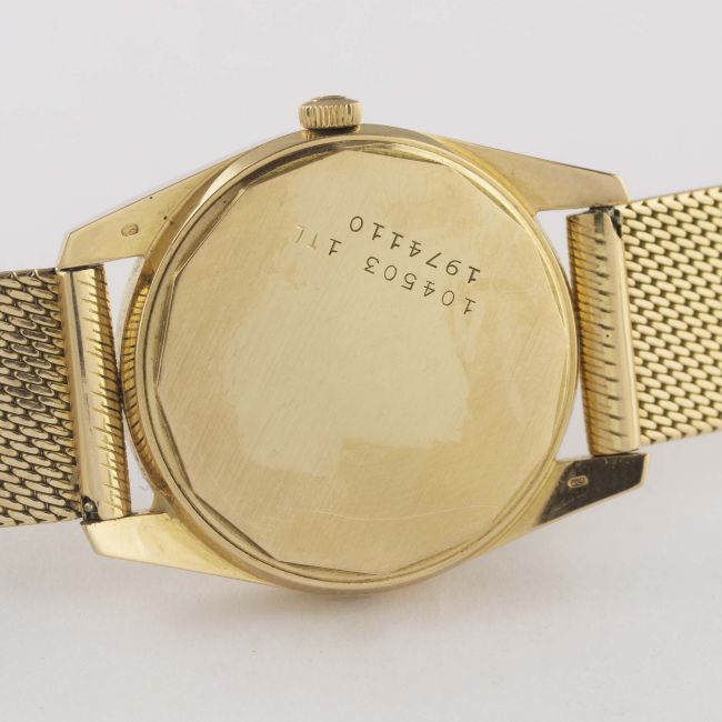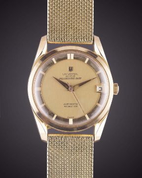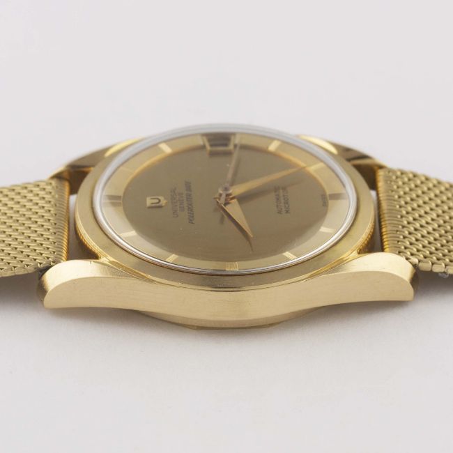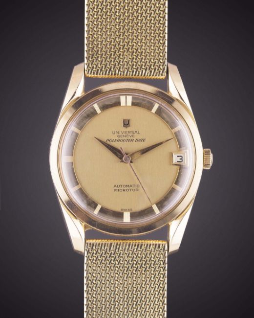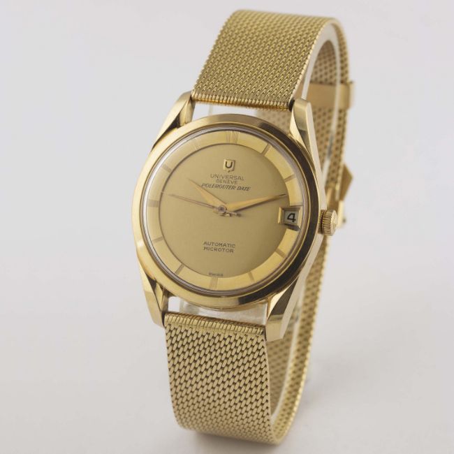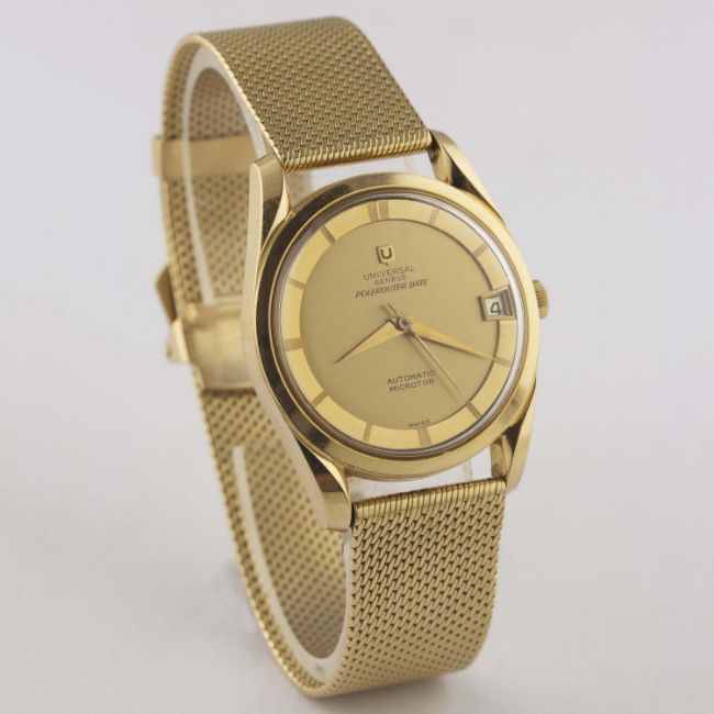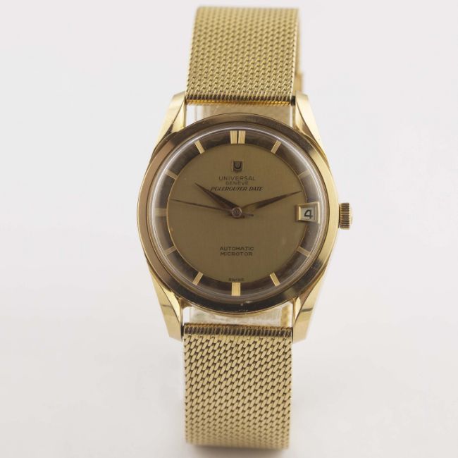 A RARE GENTLEMAN'S 18K SOLID GOLD UNIVERSAL GENEVE POLEROUTER DATE "DE LUXE" BRACELET WATCHCIRCA 1960s, REF. 104503 1TL WITH UNIVERSAL GENEVE BOX Movement: 28J, automatic Microtor, signed Universal Geneve.Case: Diameter approx. 34mm, screw back, signed Universal Geneve, 18k hallmarks, numbered, UG crown.Bracelet: Original Universal Geneve 18k solid gold mesh bracelet with fully adjustable belt style buckle. CONDITION REPORTDial: Original dial in excellent condition, some light condensation marks on the gold outer ring.Movement: Working at present.Case: In excellent condition, with light scratches due to general use.Strap/Bracelet: In very good condition.