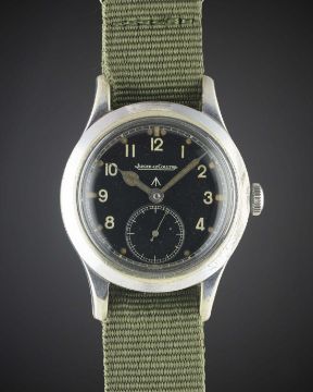 A GENTLEMAN'S BRITISH MILITARY JAEGER LECOULTRE W.W.W. WRIST WATCH CIRCA 1940s, PART OF THE "DIRTY DOZEN" Movement: Manual wind, cal. 479, signed Jaeger-LeCoultre, numbered.Case: Diameter approx. 35mm, fixed bars, nickel plated case with steel screw back, signed LeCoultre Co, issue markings 281156 ^ W.W.W. F1C486.Strap: NATO. CONDITION REPORTDial: Original dial in very good condition, showing small signs of age.Movement: Working at present.Case: In good condition, with some scratches & general wear to plating due to use.Strap/Bracelet: In excellent condition.