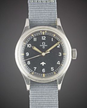 A GENTLEMAN'S STAINLESS STEEL BRITISH MILITARY OMEGA RAF PILOTS WRIST WATCH DATED 1953, REF. 2777-1 SCMovement: 17J, manual wind, cal. 283, signed Omega, numbered.Case: Diameter approx. 37mm, fixed bars, screw back, signed Omega Watch Co, issue markings ^ 6645 101000 6B/542 3205/53, dust cover.Strap: NATO. CONDITION REPORTDial: Original dial in good condition, showing some signs of age.Movement: Working at present.Case: In very good condition, with small scratches due to use.Strap/Bracelet: In excellent condition.