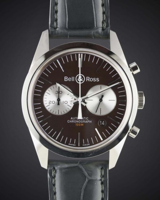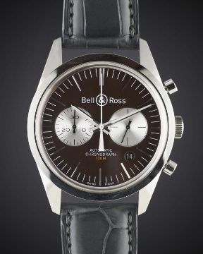 A GENTLEMAN'S STAINLESS STEEL BELL & ROSS OFFICER BROWN CHRONOGRAPH WRIST WATCHCIRCA 2017, REF. BR 126 LIMITED EDITION OF 500 PIECESMovement: 37J, automatic, cal. 301, signed Bell & Ross.Case: Diameter approx. 41mm, exhibition back, numbered, original crown.Strap: Original Bell & Ross leather strap & deployment clasp. CONDITION REPORTDial: Original dial in excellent condition.Movement: Working at present.Case: In excellent condition, one small scratch on the edge of the bezel.Strap/Bracelet: In excellent condition.