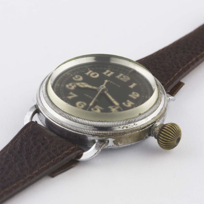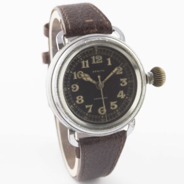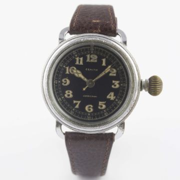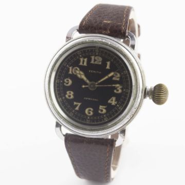 A RARE GENTLEMAN'S ZENITH SPECIAL PILOTS WRIST WATCH CIRCA 1930sMovement: Manual wind, swan neck regulator, cal. 15-1, signed Zenith, numbered. Case: Diameter approx. 41mm, nickel plated, screw top & back, numbered, inner "exhibition" cuvette, rotating bezel with inner pointer, "onion" crown.Strap: Leather. CONDITION REPORTDial: Original dial in very good condition, showing signs of age.Movement: Working at present.Case: In good condition, with some wear due to use.Strap/Bracelet: In very good condition.