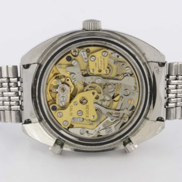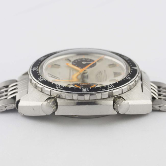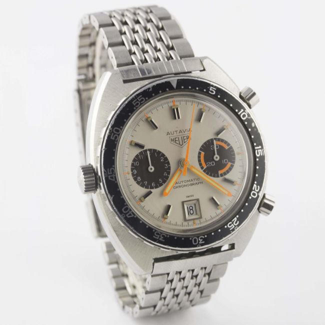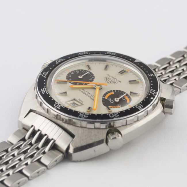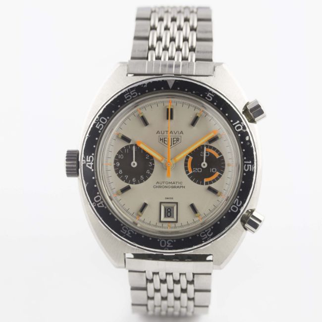 A VERY RARE GENTLEMAN'S STAINLESS STEEL HEUER AUTAVIA "WHITE ORANGE BOY" AUTOMATIC CHRONOGRAPH BRACELET WATCH CIRCA 1969, REF. 1163 Movement: 17J, automatic, cal. 11, signed Heuer.Case: Width approx. 42mm, screw back, signed Heuer-Leonidas SA, numbered, MH rotating bezel, Heuer crown & pushers.Bracelet: Original Heuer "BoR" GF bracelet with HLF end links. CONDITION REPORTDial: Original dial in excellent condition.Movement: Working at present.Case: In very good condition, with some small scratches due to general use.Strap/Bracelet: In very good condition, with light scratches due to general use.
