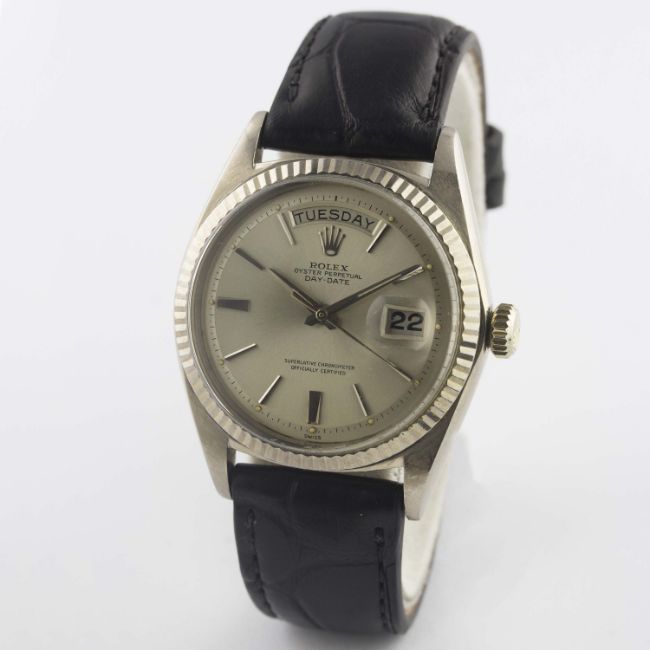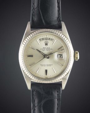 A FINE & RARE GENTLEMAN'S 18K SOLID WHITE GOLD ROLEX OYSTER PERPETUAL DAY DATE WRIST WATCHCIRCA 1963, REF. 1803 WITH "DOOR-STOP" MARKERS & "SWORD" HANDSMovement: 26J, automatic chronometer, cal. 1555, signed Montres Rolex S.A., numbered.Case: Diameter approx. 36mm, Oyster case, signed Montres Rolex S.A., numbered, 18k hallmarks, fluted bezel, Rolex twinlock crown.Strap: Leather. CONDITION REPORTDial: Original dial in excellent condition, showing some very small signs of age.Movement: Working at present.Case: In excellent condition, with light scratches due to general use, a very light dent to case back.Strap/Bracelet: In excellent condition.