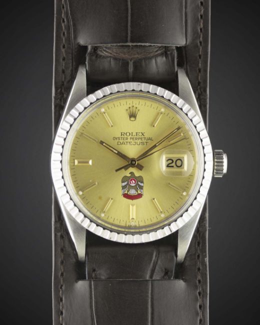 A VERY RARE GENTLEMAN'S STAINLESS STEEL ROLEX OYSTER PERPETUAL DATEJUST WRIST WATCHCIRCA 1982, REF. 16030 WITH UNITED ARAB EMIRATES FEDERATION "SMALL EAGLE" LOGO DIALMovement: 27J, automatic chronometer, cal. 3035, signed Rolex S.A., numbered.Case: Diameter approx. 36mm, Oyster case, signed Montres Rolex S.A., numbered, milled bezel, Rolex crown.Strap: Leather BUND style. CONDITION REPORTDial: Original dial in excellent condition, a very small mark between 7 & 8 o'clock positions.Movement: Working at present.Case: In excellent condition, with some light scratches due to general use.Strap/Bracelet: In excellent condition.