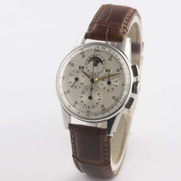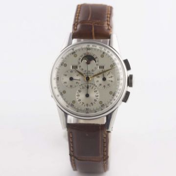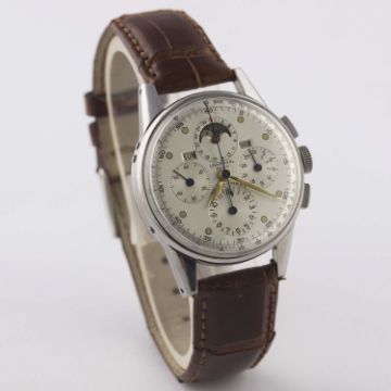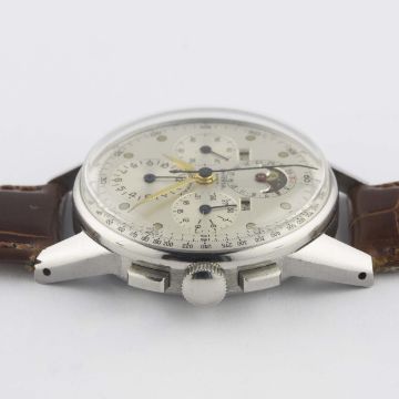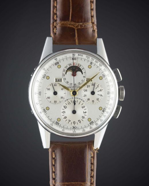 A RARE GENTLEMAN'S STAINLESS STEEL UNIVERSAL GENEVE TRI COMPAX MOONPHASE TRIPLE CALENDAR CHRONOGRAPH WRIST WATCHCIRCA 1940s, REF. 22258 Movement: Manual wind, cal. 481, signed Universal Geneve, numbered.Case: Diameter approx. 35mm, snap back, signed Universal Geneve, numbered.Strap: Leather. CONDITION REPORTDial: Original dial in excellent condition, showing some very small signs of age.Movement: Working at present.Case: In excellent condition, with some light scratches due to occasional use.Strap/Bracelet: In excellent condition.