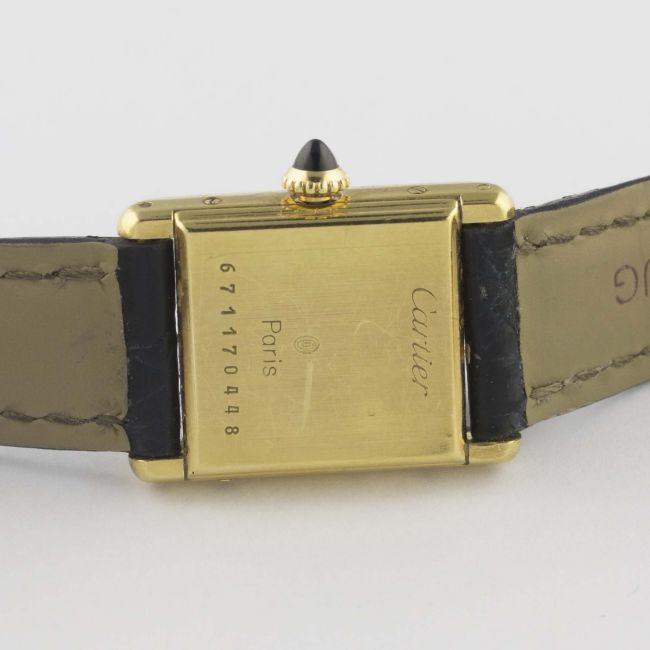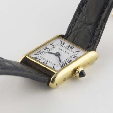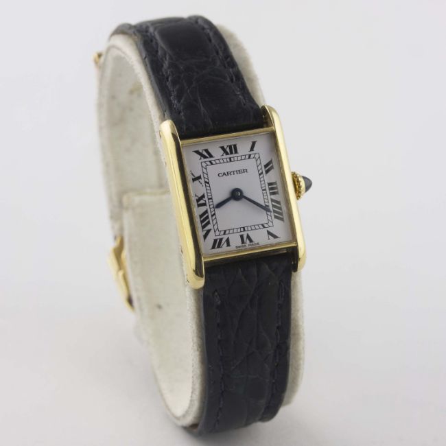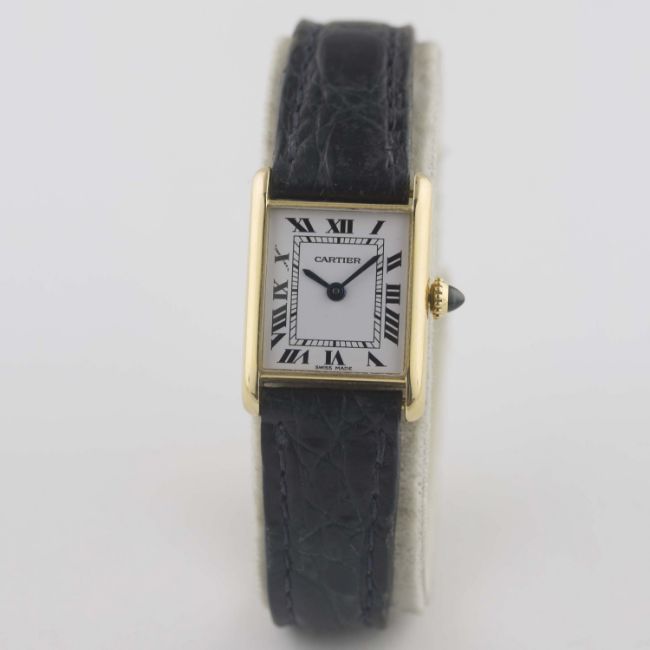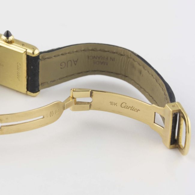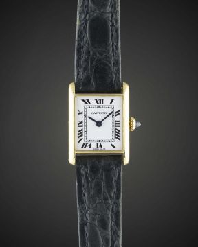 A LADIES 18K SOLID GOLD CARTIER TANK WRIST WATCHCIRCA 1980sMovement: Manual wind, signed Cartier.Case: Width approx. 19mm, signed Cartier Paris, numbered, 18k hallmarks, sapphire crown. Strap: Cartier leather strap with original 18k solid gold Cartier deployment clasp. CONDITION REPORTDial: Original dial in excellent condition.Movement: Working at present.Case: In very good condition, with some small scratches due to general use.Strap/Bracelet: In fair condition, deployment clasp in very good condition.